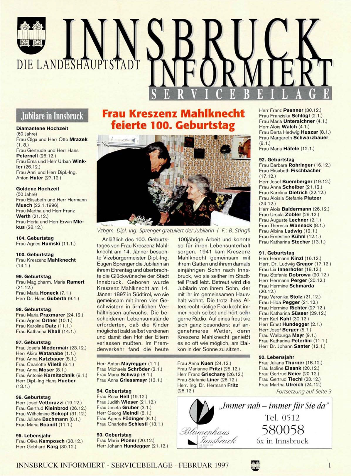Anläßlich des 100. Geburtstages von Frau Kreszenz Mahlknecht am 14. Jänner besuchte Vizebürgermeister Dipl.-Ing.
