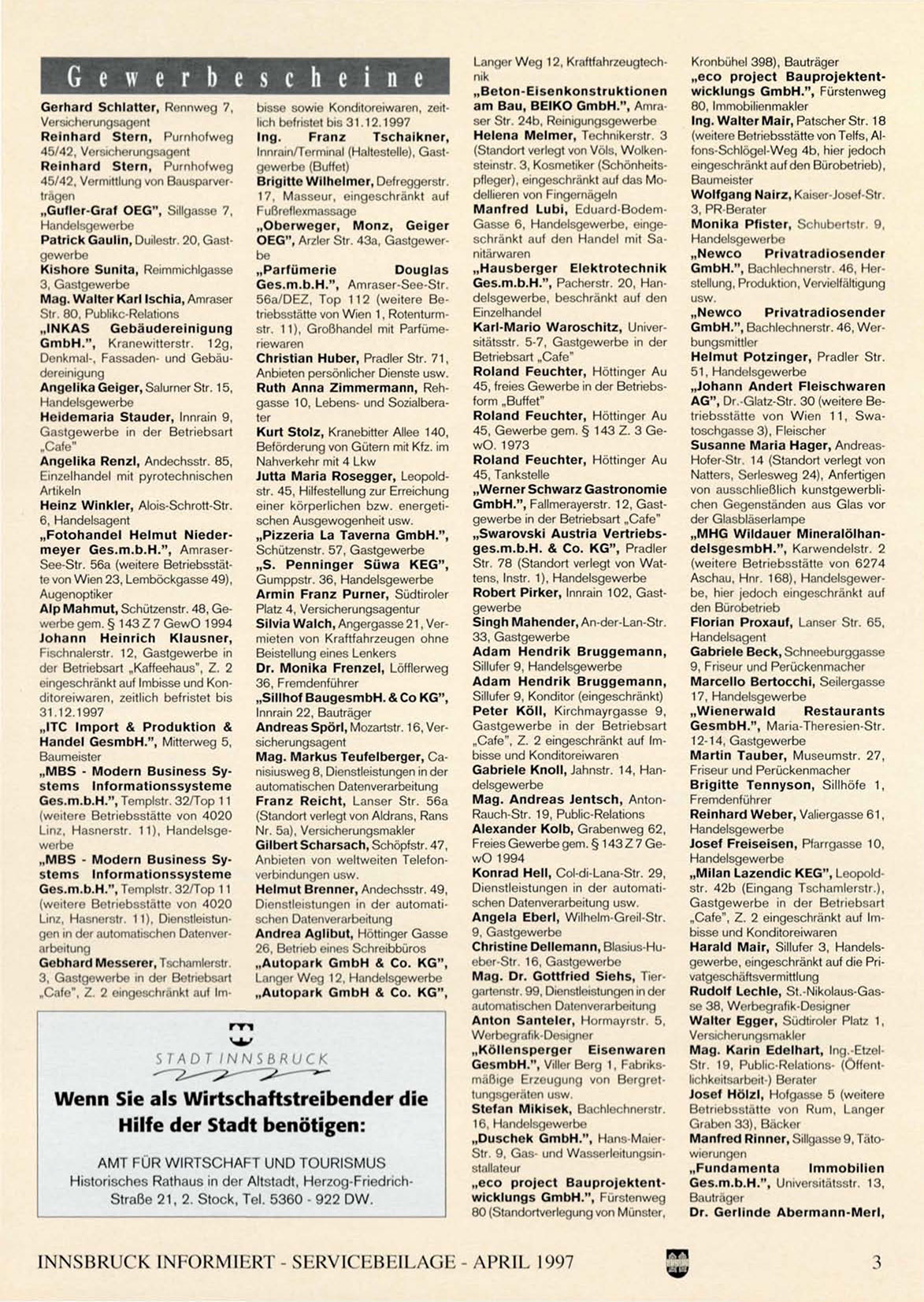 OEG", Arzler Str. 43a, GastgewerPatrick Gaulin, Duilestr. 20, Gastbe