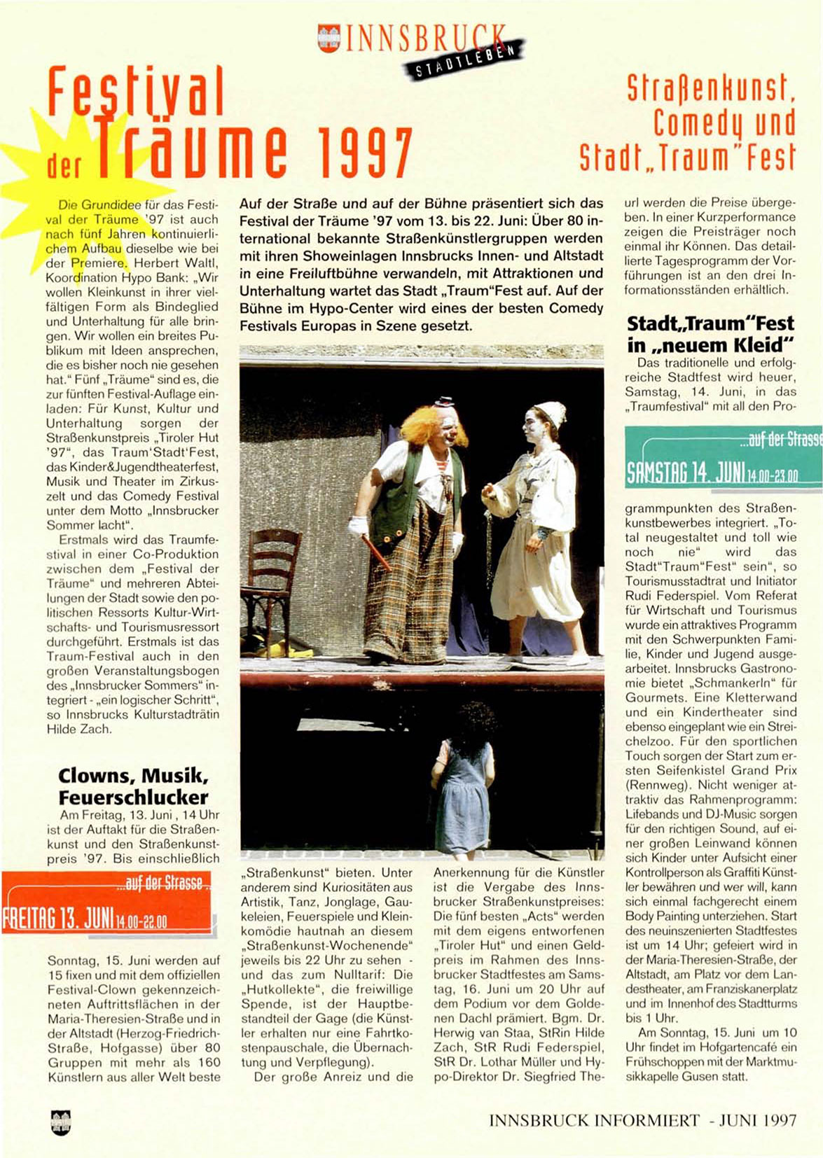 Festival der Träume "97 vom 13. bis 22. Juni: Über 80 international bekannte Straßenkünstlergruppen werden
