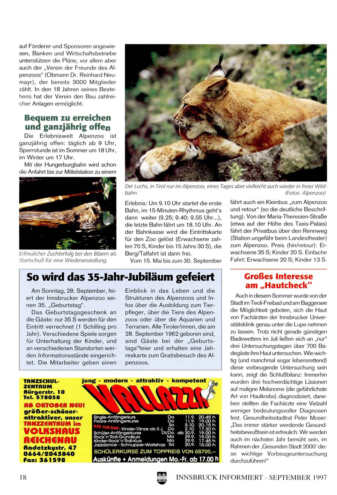 zum Alpenzoo. Preis (hin/retour): Erwachsene 35 S; Kinder 20 S. Einfache