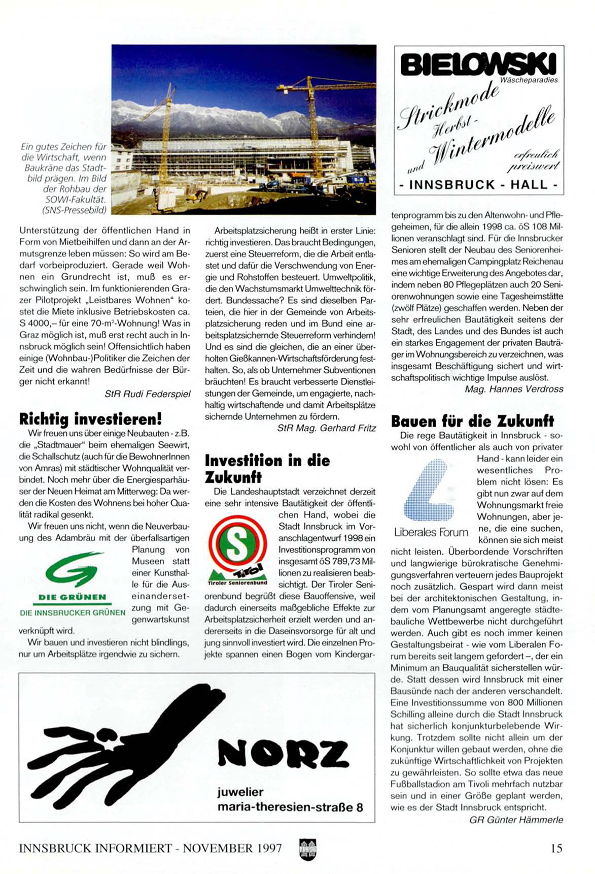 tenprogramm bis zu den Altenwohn- und Riegeheimen, für die allein 1998 ca. öS 108 Millionen veranschlagt sind. Für die Innsbrucker