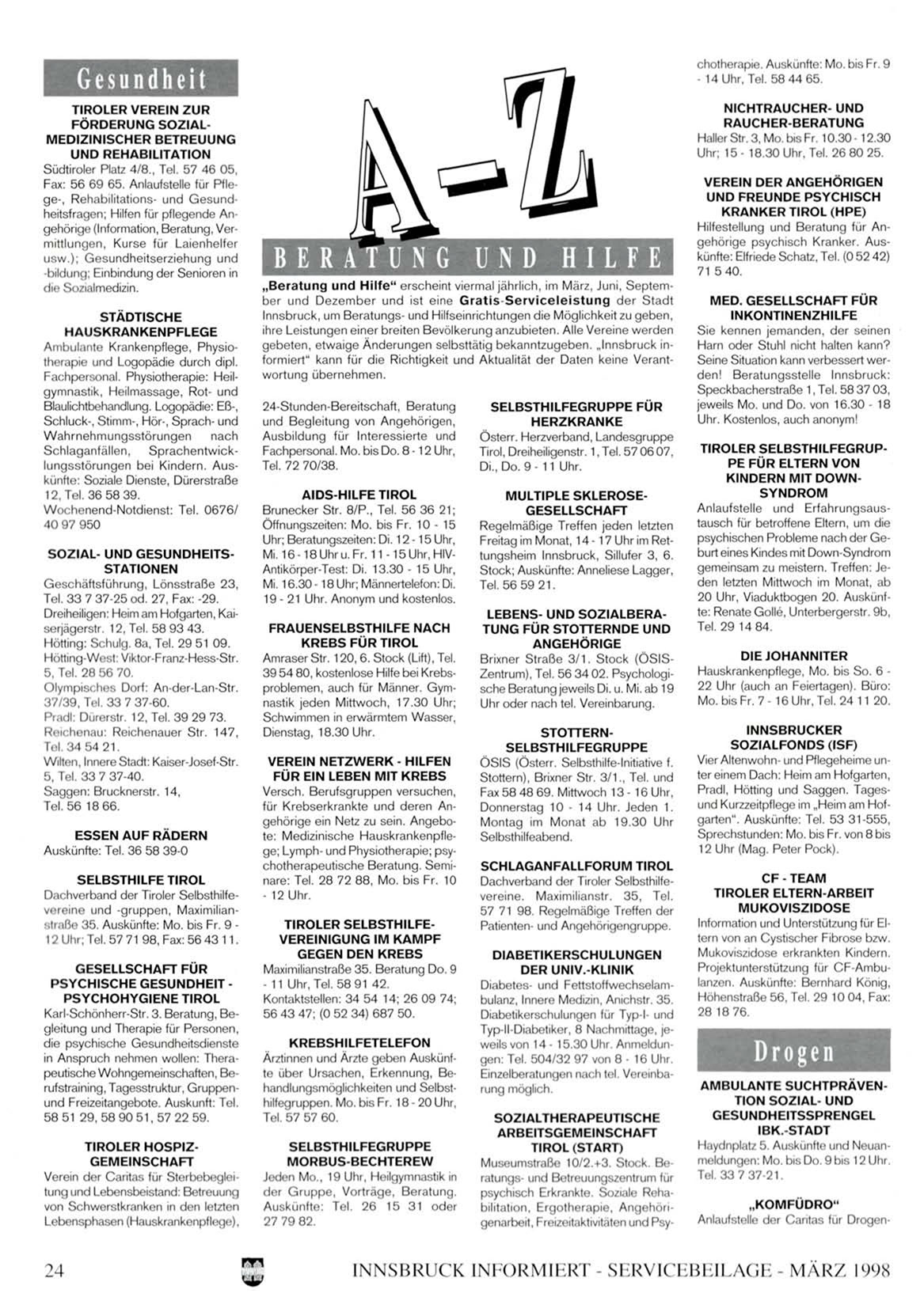 Dachverband der Tiroler Selbsthilfevereine und -gruppen, Maximilianstrnße 35. Auskünfte: Mo. bis Fr. 9 12 Uhr; Tel. 57 71 98, Fax: 56 43 11.