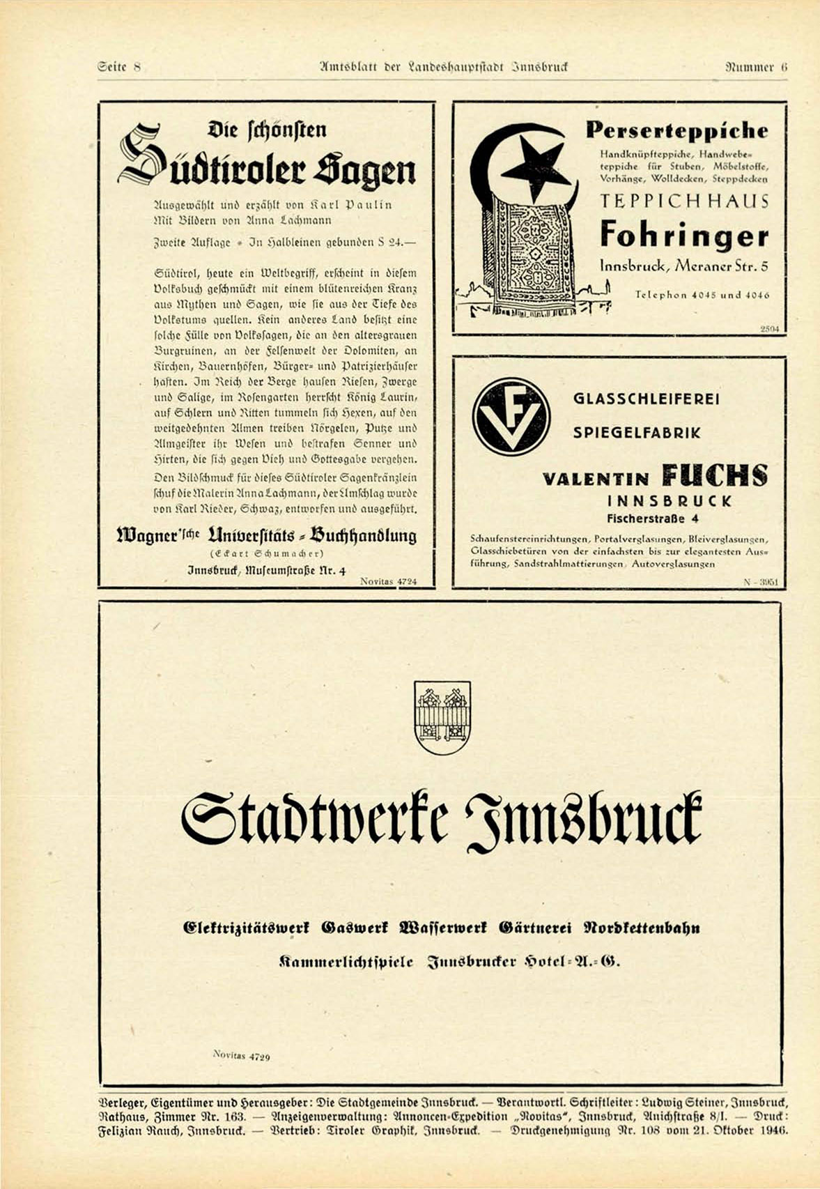 Verleger, Eigentümer und Herausgeber: Vie Stndtqeineinde Innsbruck.