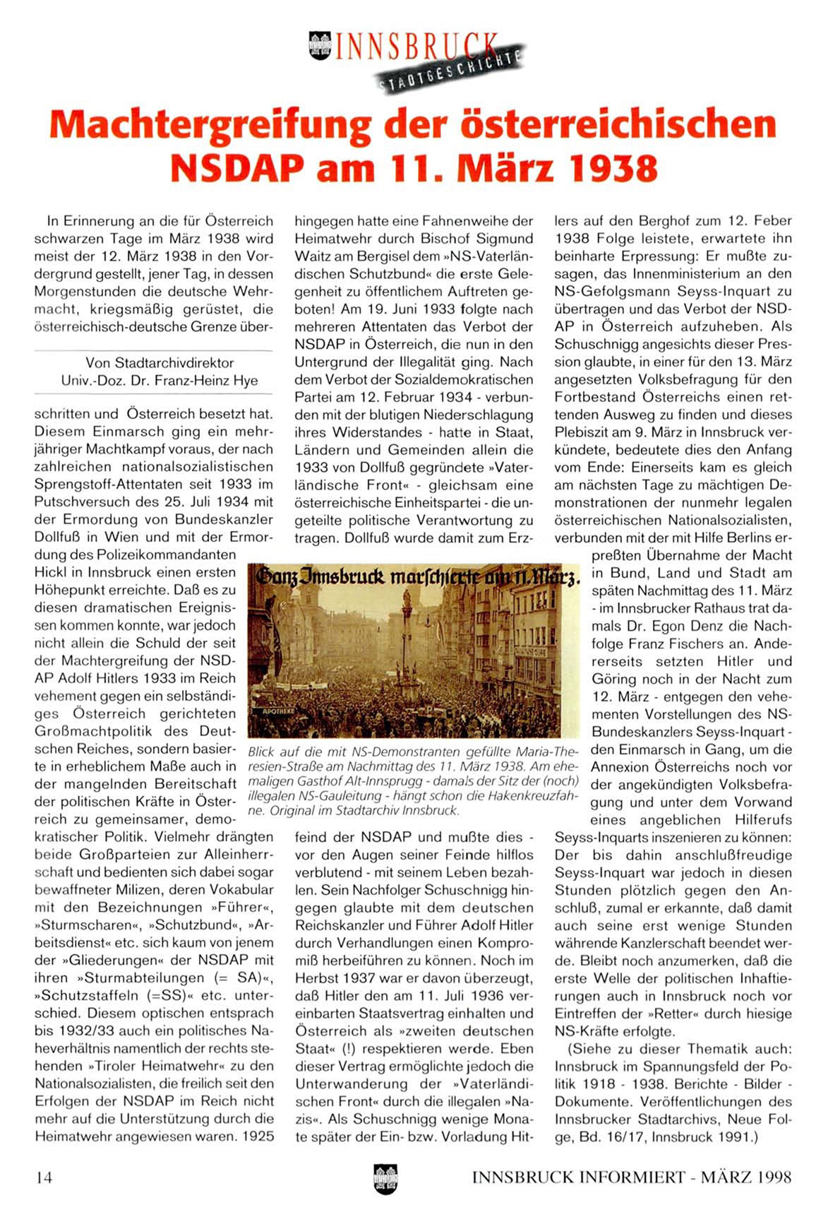 mehr auf die Unterstützung durch die zis«. Als Schuschnigg wenige MonaInnsbrucker Stadtarchivs, Neue FolHeimatwehr angewiesen waren. 1925 te später der Ein- bzw. Vorladung Hitge, Bd. 16/17, Innsbruck 1991.)