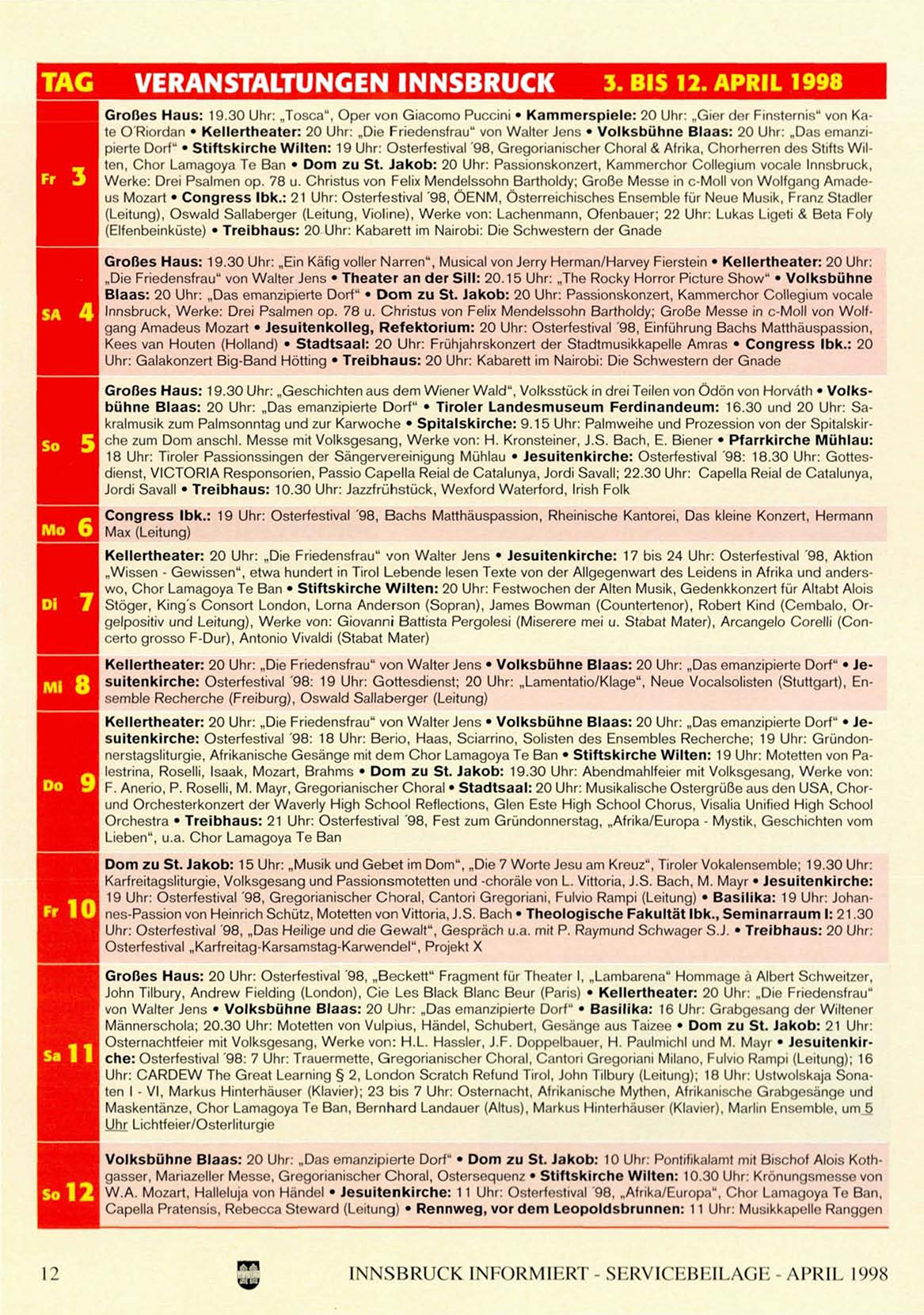 19 Uhr: Osterfestival "98, Gregorianischer Choral, Cantori Gregonani, Fulvio Rampi (Leitung) • Basilika: 19 Uhr: Johannes-Passion von Heinrich Schütz, Motetten von Vittoria, J.S. Bach • Theologische Fakultät Ibk., Seminarraum I: 21.30