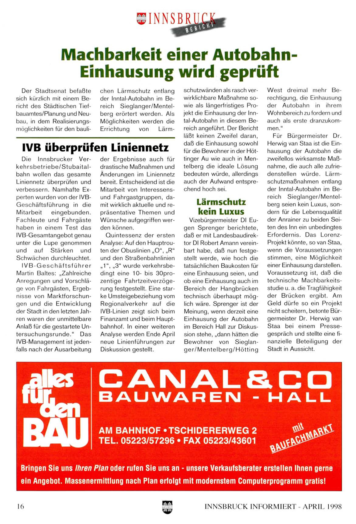 schutzwänden als rasch verwirklichbare Maßnahme sowie als längerfristiges Projekt die Einhausung der Inntal-Autobahn in diesem Bereich angeführt. Der Bericht