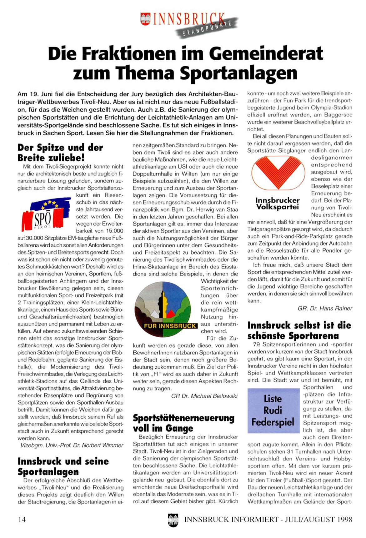 auszunützen und permanent mit Leben zu erfüllen. Auf ebenso zukunftsweisenden Schienen steht das sonstige Innsbrucker Sportstättenkonzept, was die Sanierung der olympischen Stätten (erfolgte Erneuerung der Bobund Rodelbahn, geplante Sanierung der Eishalle), die Modernisierung des TivoliFreischwimmbades, die Verlegung des Leichtathletik-Stadions auf das Gelände des Universität-Sportinstitutes, die Attraktivierung bestehender Rasenplätze und Begrünung von