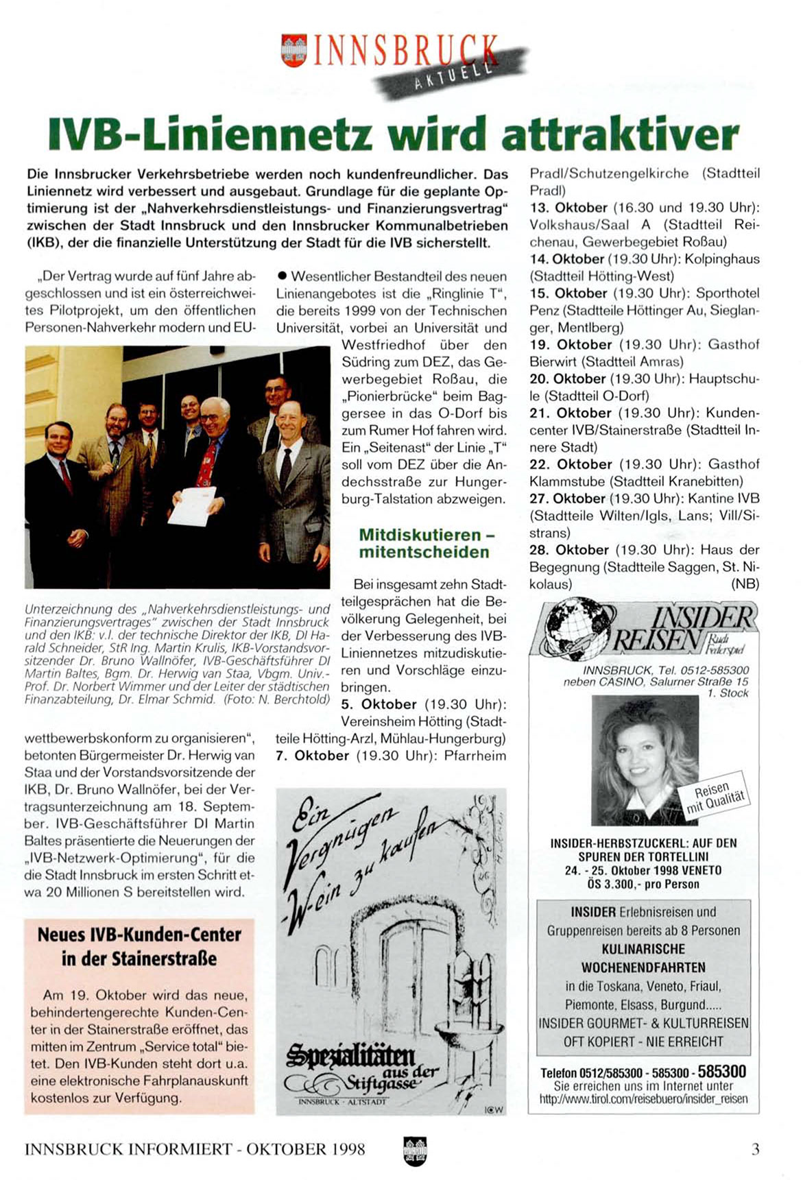 und den 1KB: v.l. der technische Direktor der 1KB, Dl Ha- der Verbesserung des IVBrald Schneider, StR Ing. Martin Krulis, IKB-Vorstandsvorsitzender Dr. Bruno Wallnôfer, IVB-Geschaftsfuhrer Dl Liniennetzes mitzudiskutieMartin Baltes, Bgm. Dr. Herwig van Staa, Vbgm. Univ.- ren und Vorschlâge einzuProf. Dr. Norbert Wimmer und der Leiter der stadtischen bringen.