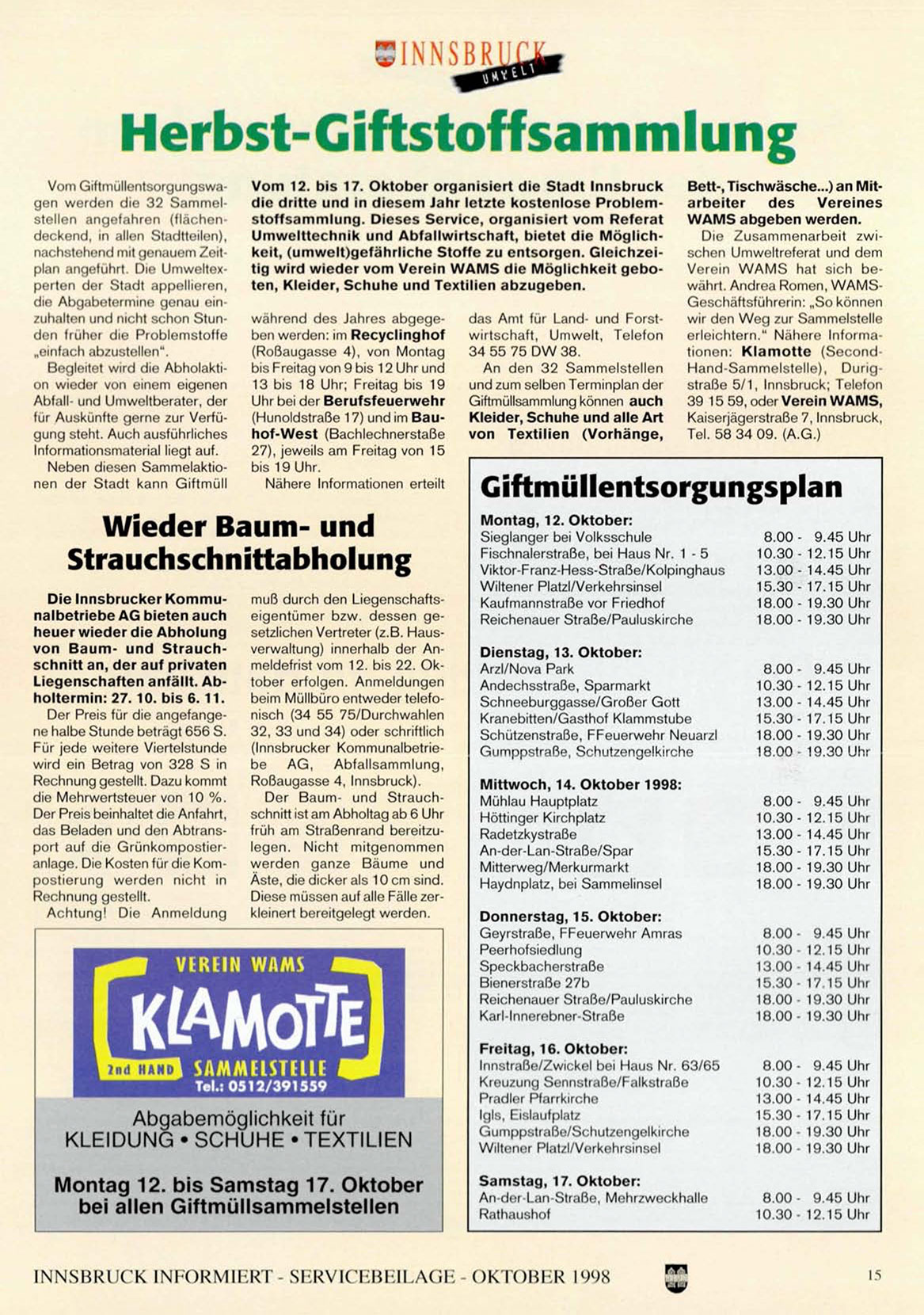 Umwelttechnik und Abfallwirtschaft, bietet die Moglichkeit, (umwelt)gefahrliche Stoffe zu entsorgen. Glcichzeitig wird wieder vom Verein WAMS die Moglichkeit geboten, Kleider, Schuhe und Textilien abzugeben.