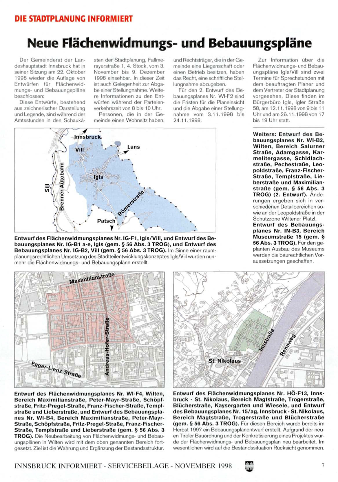 Bebauungsplanes Nr. IG-B2, Vill (gem. § 56 Abs. 3 TROG). Im Sinne einer raumplanungsrechtlichen Umsetzung des Stadtteilentwicklungskonzeptes Igls/Vill wurden nunmehr die Flächenwidmungs- und Bebauungspläne erstellt.