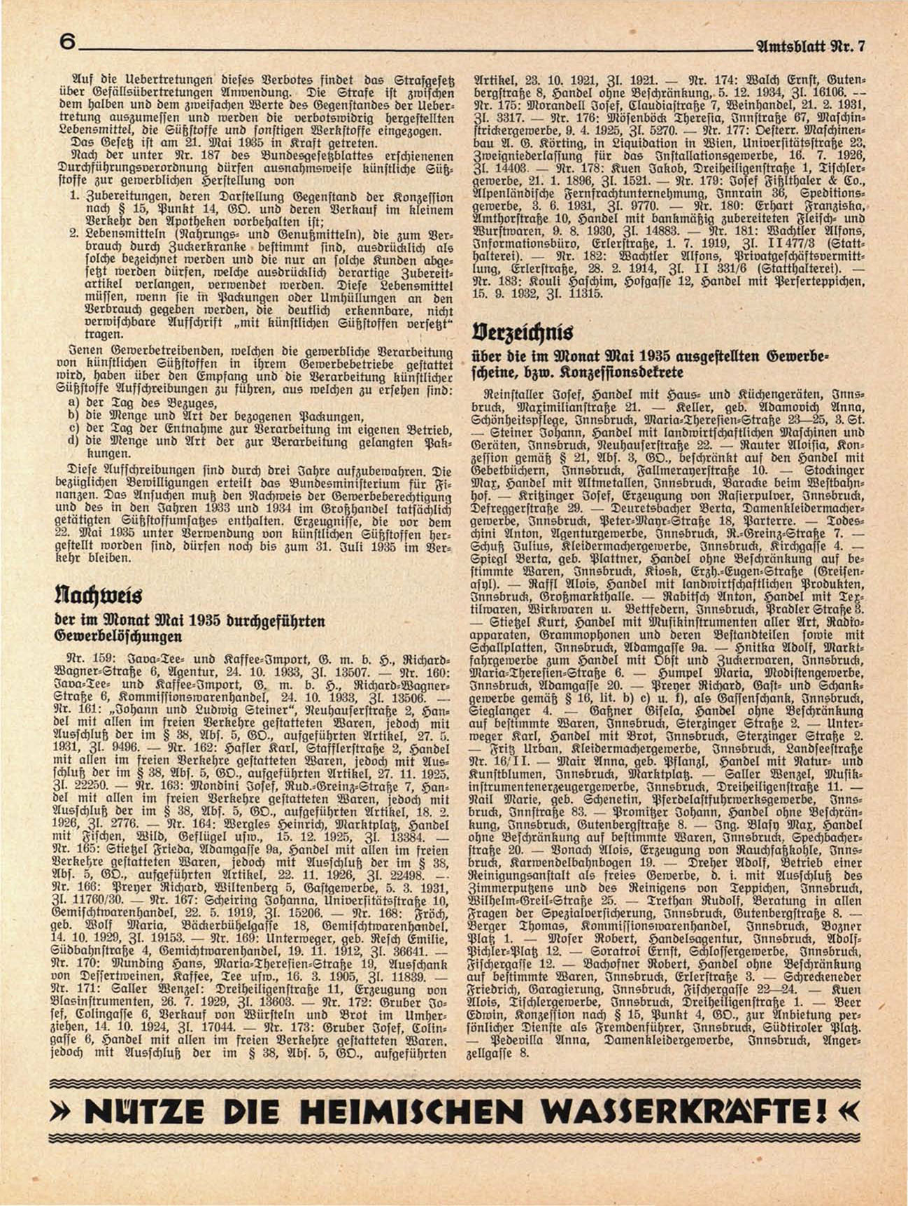 Zl. 3317. — Nr. 176: Mösenböck Theresia. Innstraße 67. Maschinstrickergewerbe, 9. 4. 1925. Zl. 5270. — Nr. 177: Oesterr. Maschinenbau A. G. Körting, in Liquidation in Wien, Universitätsstraße 23.