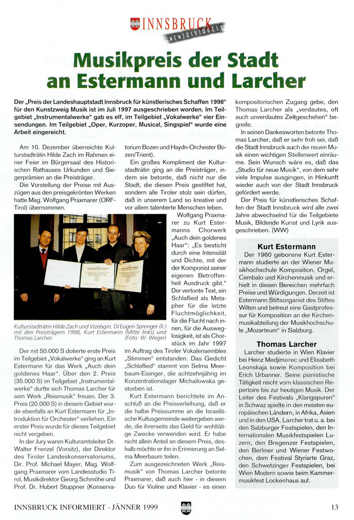 Der „Preis der Landeshauptstadt Innsbruck für künstlerisches Schaffen 1998"