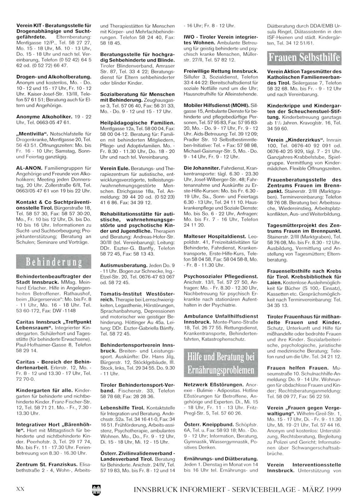 IWO - Tiroler Verein integriertes Wohnen. Ambulante Uetieuung für geistig behinderte und psychisch kranke Menschen, Müllerstr. 27/II, Tel. 57 82 12.