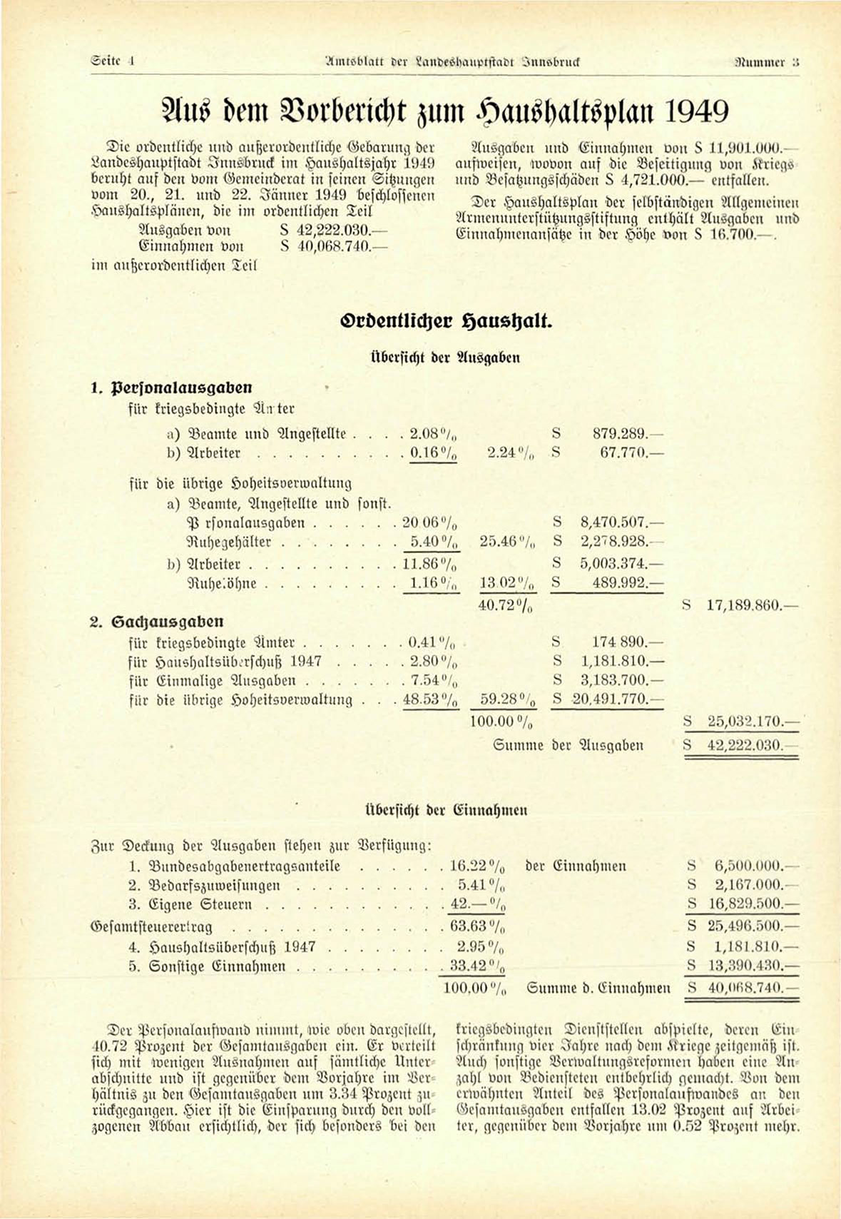 Landeshauptstadt Innsbruck ini Haushaltsjahr 1949