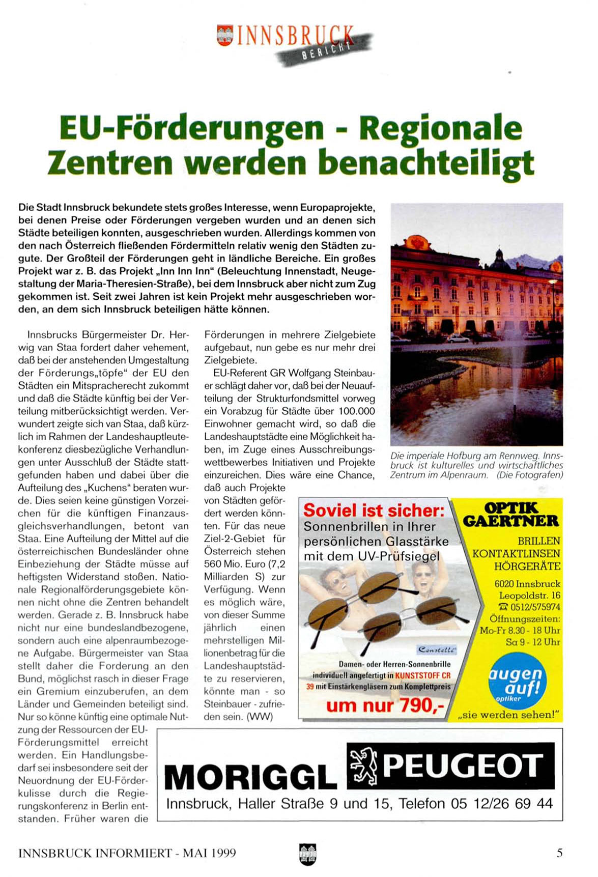 Projekt war z. B. das Projekt „Inn Inn Inn" (Beleuchtung Innenstadt, Neugestaltung der Maria-Theresien-Straße), bei dem Innsbruck aber nicht zum Zug