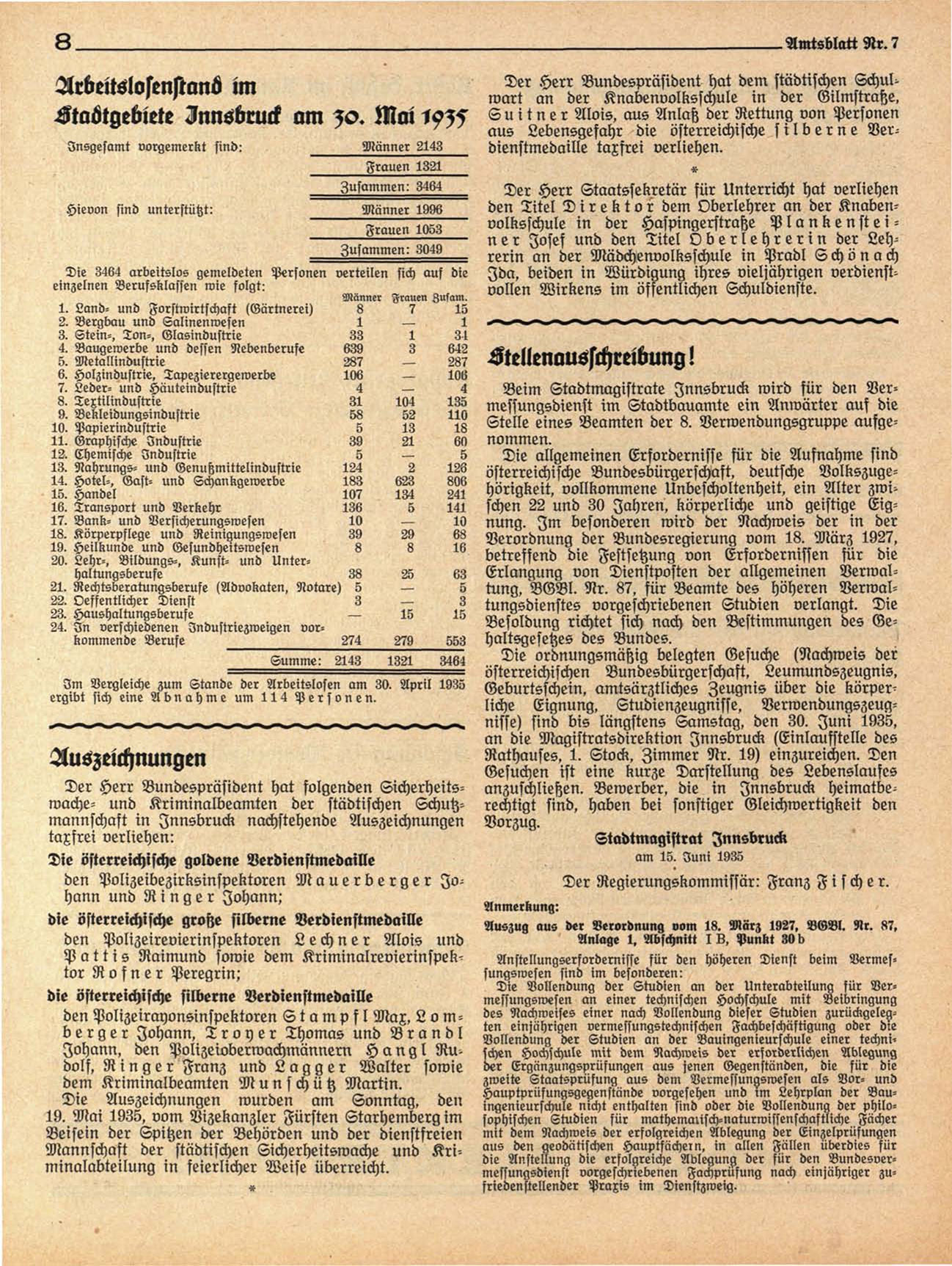 I m Vergleiche zum Stande der Arbeitslosen am 30. April 1935 Geburtsschein, amtsärztliches Zeugnis über die körperergibt sich eine A b n a h m e um 114 P e r s o n e n .
