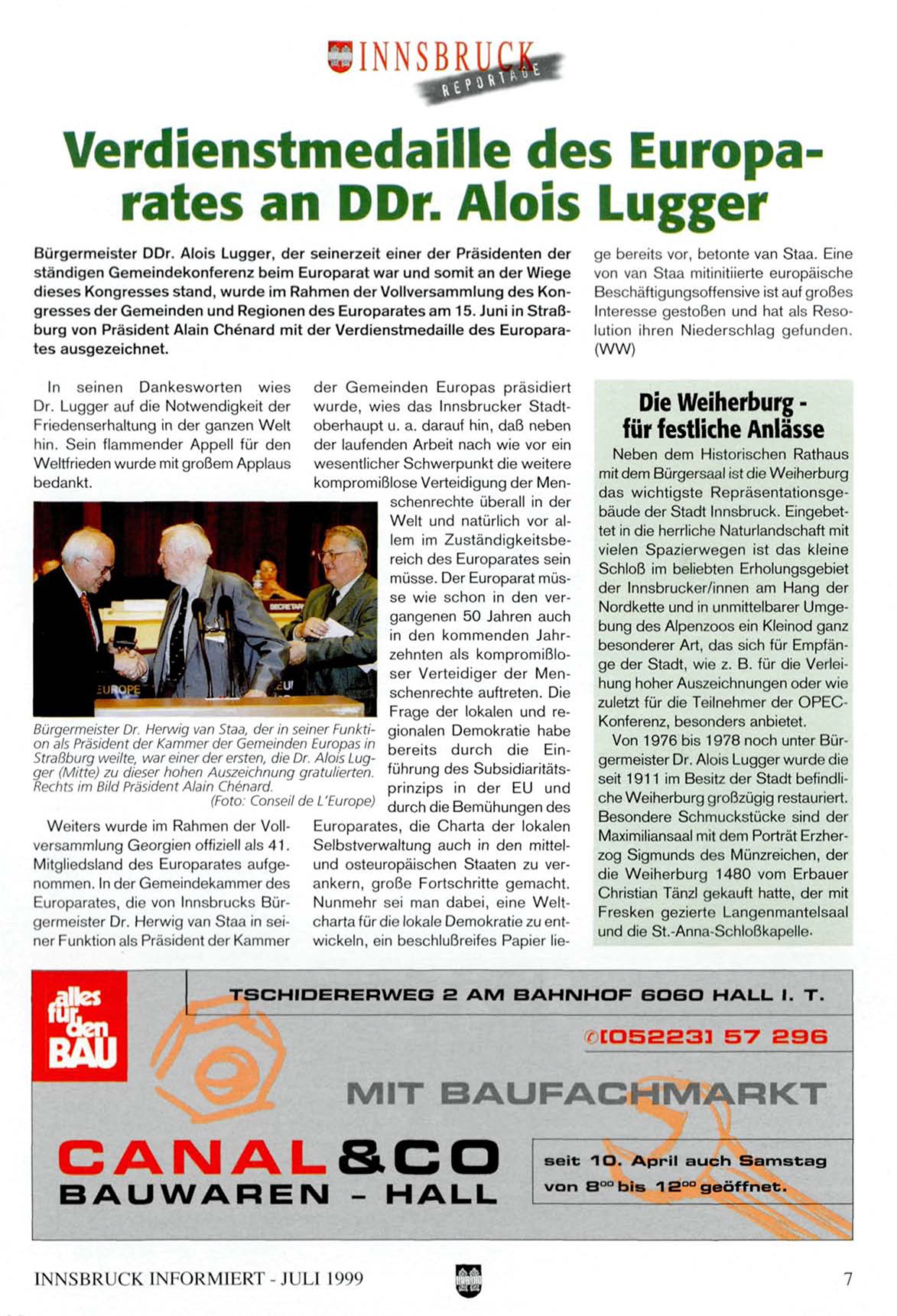 Verdienstmedaille des Europarates an DDr. Alois Lugger
