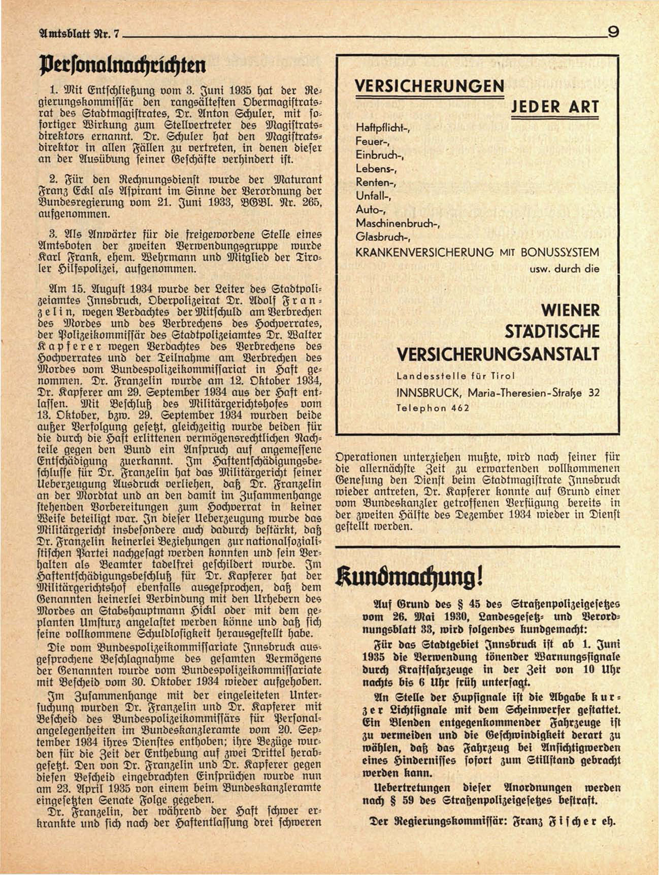 Am 15. August 1934 wurde der Leiter des Stadtvolizeiamtes Innsbruck, Oberpolizeirat Dr. Adolf F r a n g e l i n , wegen Verdachtes der Mitschuld am Verbrechen
