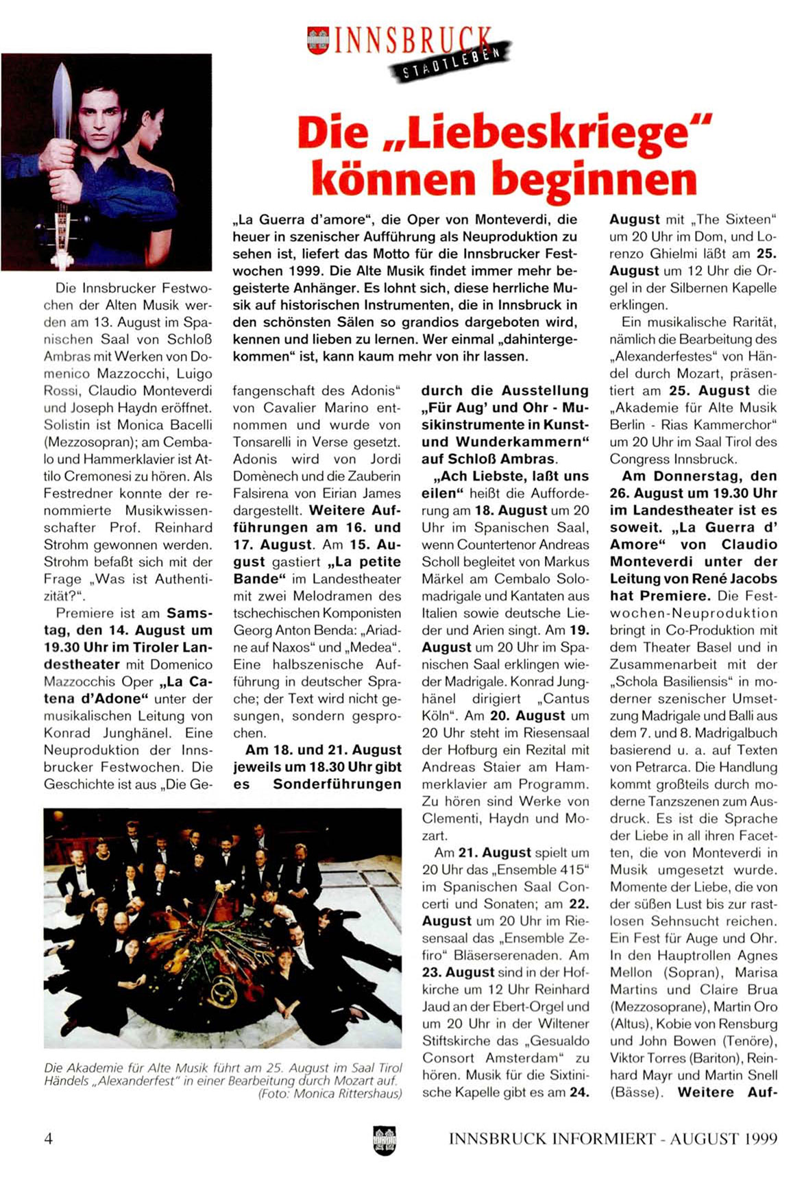 sehen ist, liefert das Motto für die Innsbrucker Festwochen 1999. Die Alte Musik findet immer mehr begeisterte Anhänger. Es lohnt sich, diese herrliche Musik auf historischen Instrumenten, die in Innsbruck in