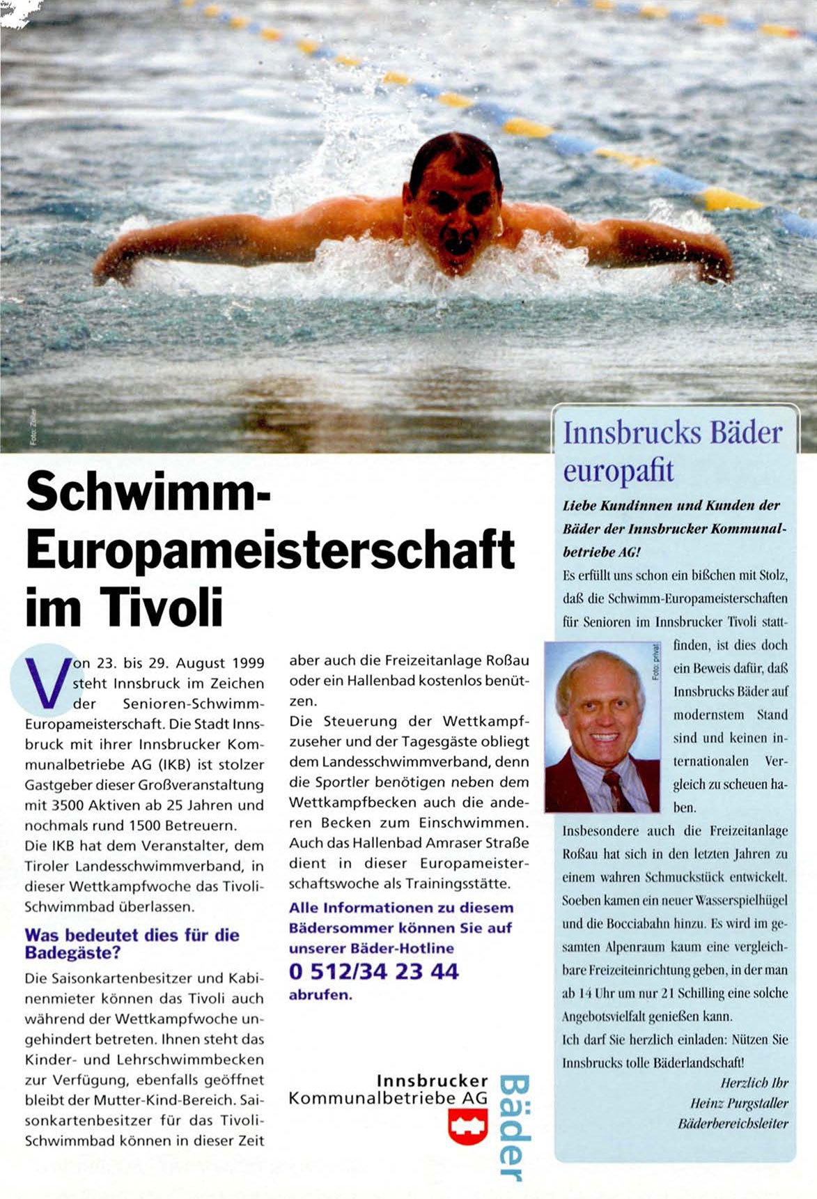 Senioren-SchwimmEuropameisterschaft. Die Stadt Innsbruck mit ihrer Innsbrucker Kommunalbetriebe AG (1KB) ist stolzer