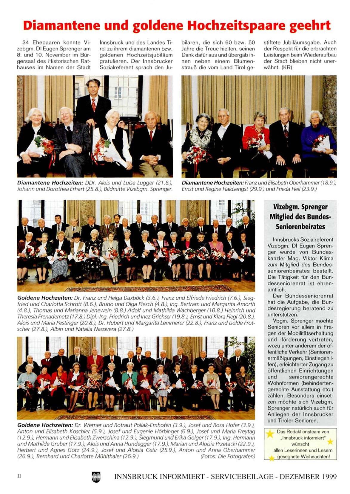 Goldene Hochzeiten: Dr. Franz und Helga Daxböck (3.6.), Franz und Elfhede Friedrich (7.6.), Sieghat die Aufgabe, die Bunfried und Charlotta Schrott (8.6.), Bruno und Olga Piesch (4.8.), Ing. Bertram und Margarita Amorth