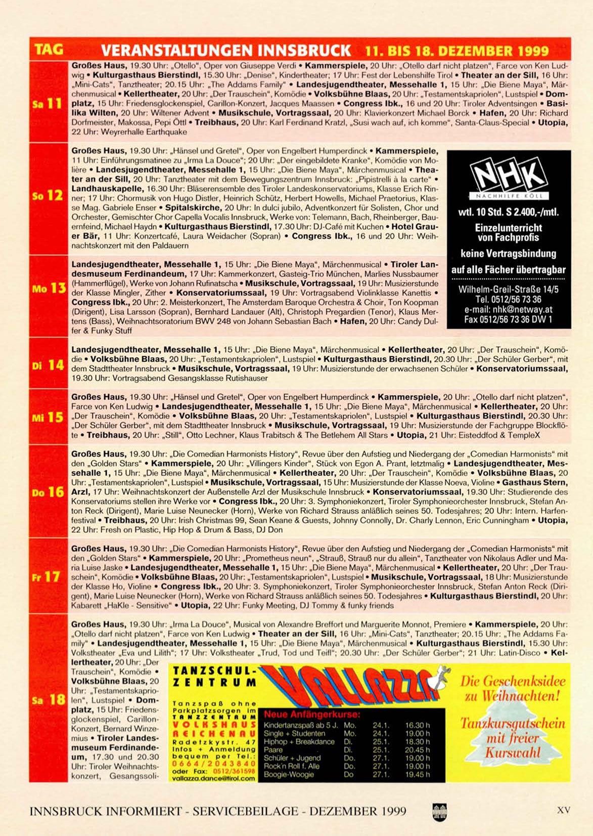 Orchester, Gemischter Chor Capella Vooalis Innsbruck, Werke von: Telemann, Bach, Rheinberger, Bauernfeind, Michael Haydn • Kulturgasthaus Bierstindl, 17.30 Uhr: DJ-Cafe mit Kuchen • Hotel Grauer Bär, 11 Uhr: Konzertcafe, Laura Weidacher (Sopran) • Congress Ibk., 16 und 20 Uhr: Weihnachtskonzort mit den Paldauern