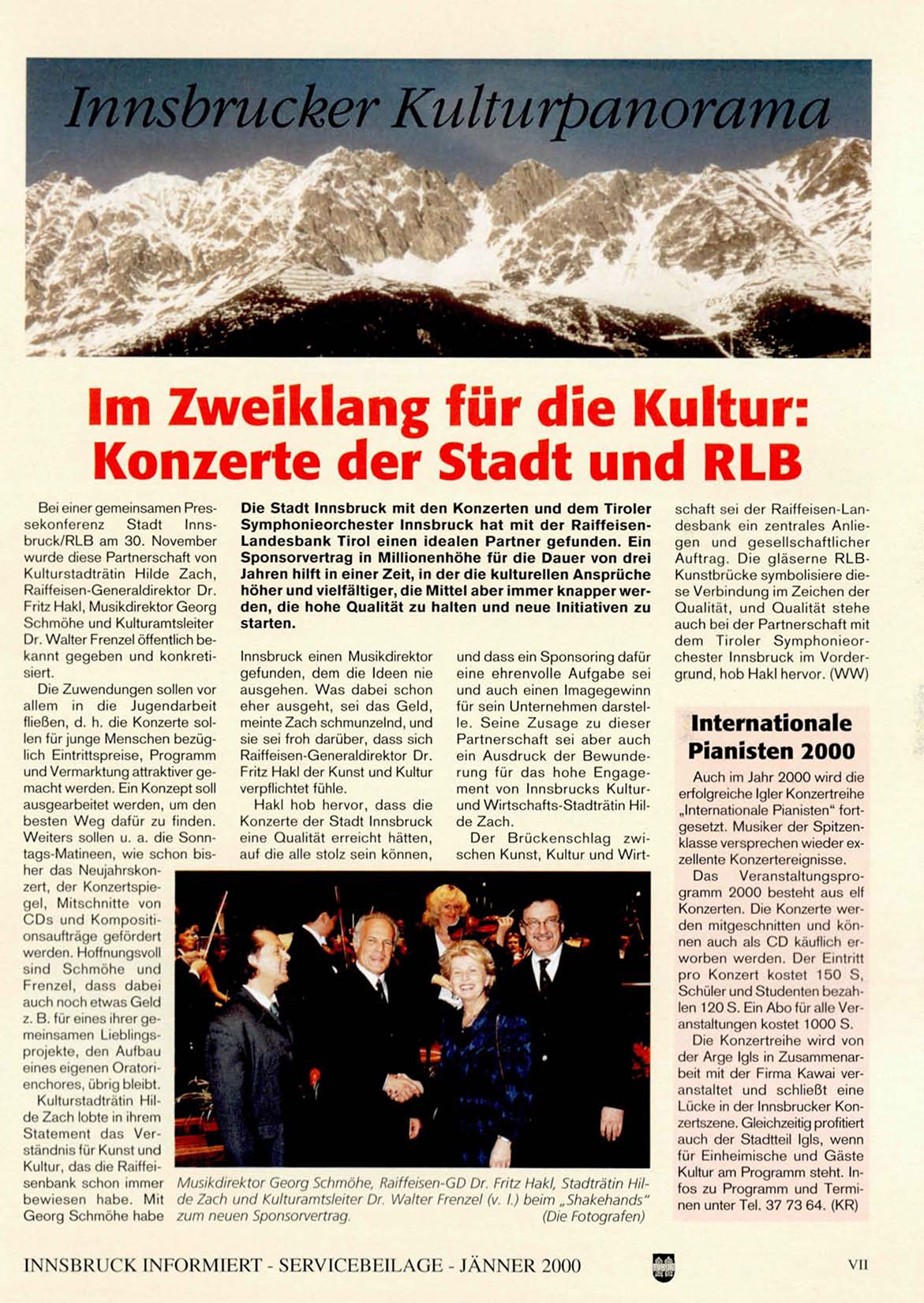 Kultur, das die Raiffeisenbank schon immer Musikdirektor Georg Schmöhe, Raiffeisen-GD Dr. Fritz Hakl, Stadträtin Hilbewiesen habe. Mit de Zach und Kulturamtsleiter Dr. Walter Frenzel (v. I.) beim „Shakehands"