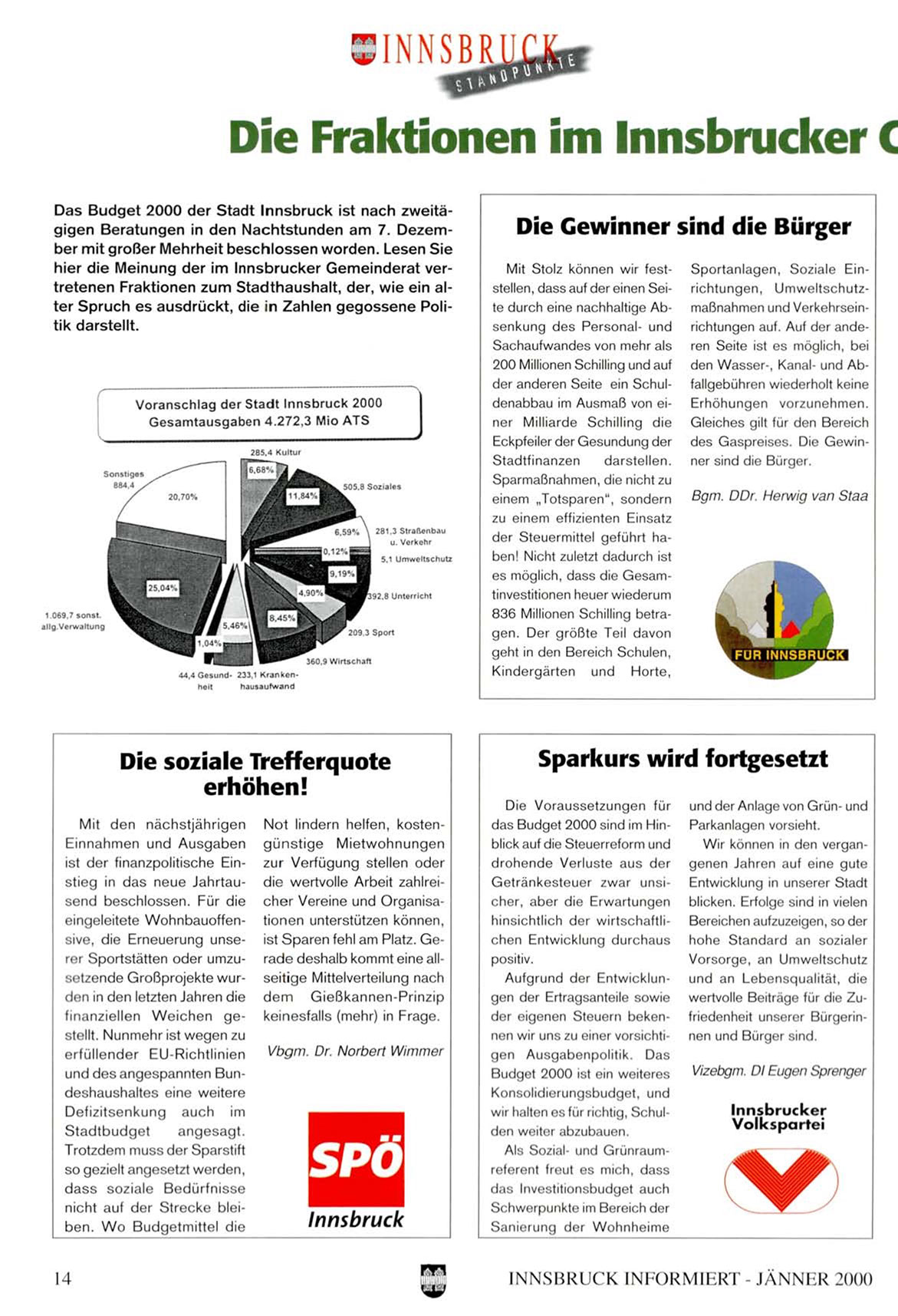 D a s B u d g e t 2 0 0 0 der S t a d t I n n s b r u c k ist n a c h z w e i t ä g i g e n B e r a t u n g e n in d e n N a c h t s t u n d e n a m 7. D e z e m ber m i t g r o ß e r M e h r h e i t b e s c h l o s s e n w o r d e n . L e s e n S i e