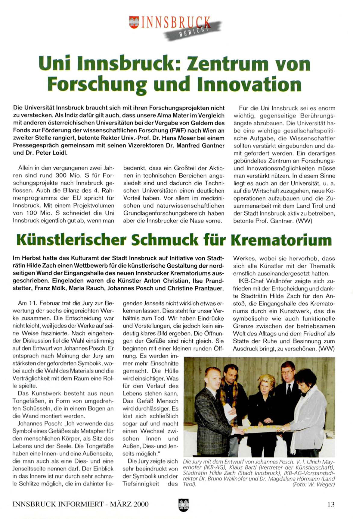 Im H e r b s t h a t t e d a s K u l t u r a m t d e r S t a d t I n n s b r u c k auf Initiative v o n S t a d t rätin H i l d e Z a c h e i n e n W e t t b e w e r b f ü r d i e k ü n s t l e r i s c h e G e s t a l t u n g d e r n o r d seifigen Wand der Eingangshalle des neuen Innsbrucker K r e m a t o r i u m s ausg e s c h r i e b e n . E i n g e l a d e n w a r e n d i e K ü n s t l e r A n t o n C h r i s t i a n , Ilse P r a n d s t e t t e r , Franz M o l k , Maria R a u c h , J o h a n n e s P o s c h u n d C h r i s t i n e P r a n t a u e r .