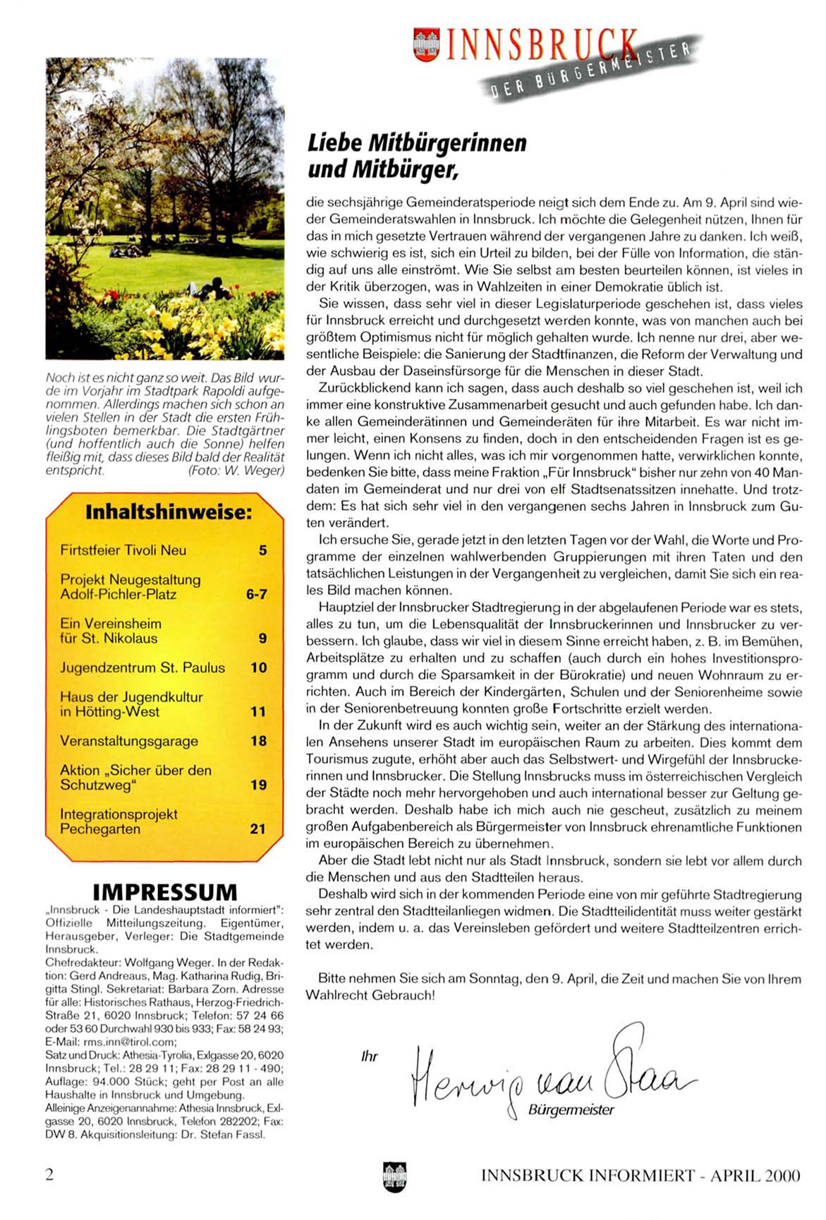 die sechsjährige Gemeinderatsperiode neigt sich dem Ende zu. Am 9. April sind wieder Gemeinderatswahlen in Innsbruck. Ich möchte die Gelegenheit nützen, Ihnen für