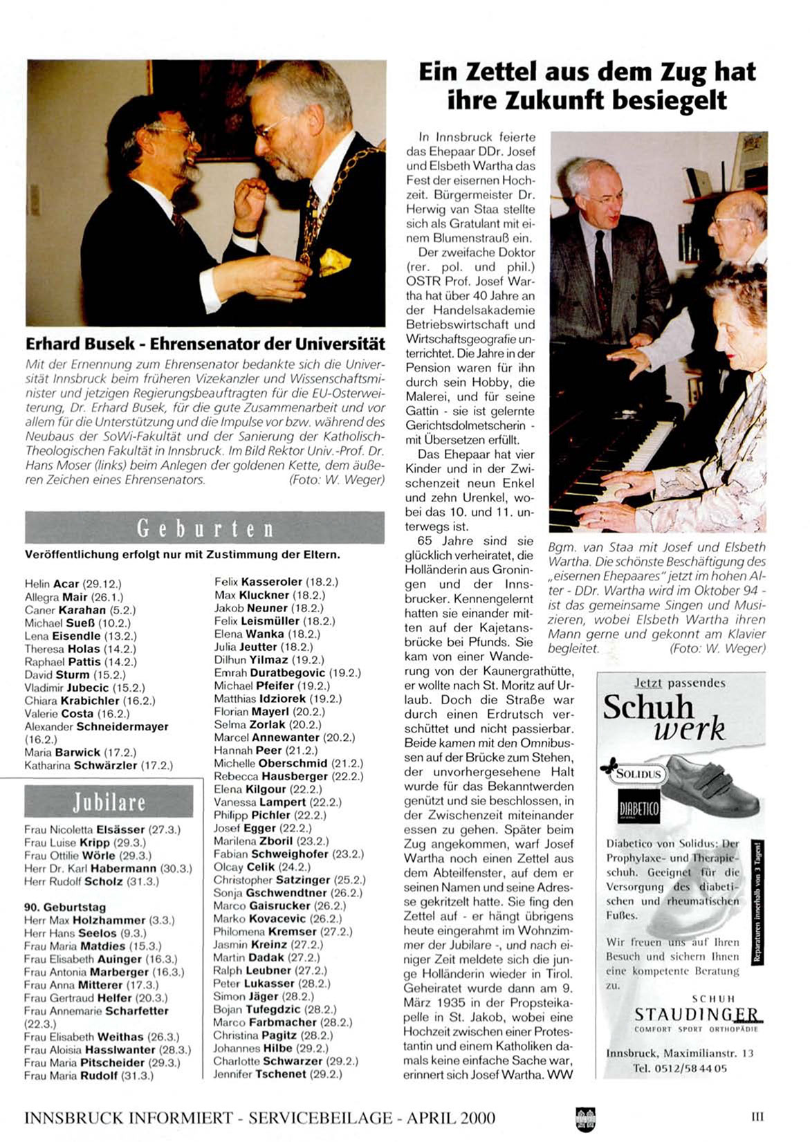 Mit der Ernennung zum Ehrensenator bedankte sich die Universität Innsbruck beim früheren Vizekanzler und Wissenschaftsminister und jetzigen Regierungsbeauftragten für die EU-Osterweiterung, Dr. Erhard Busek, für die gute Zusammenarbeit und vor