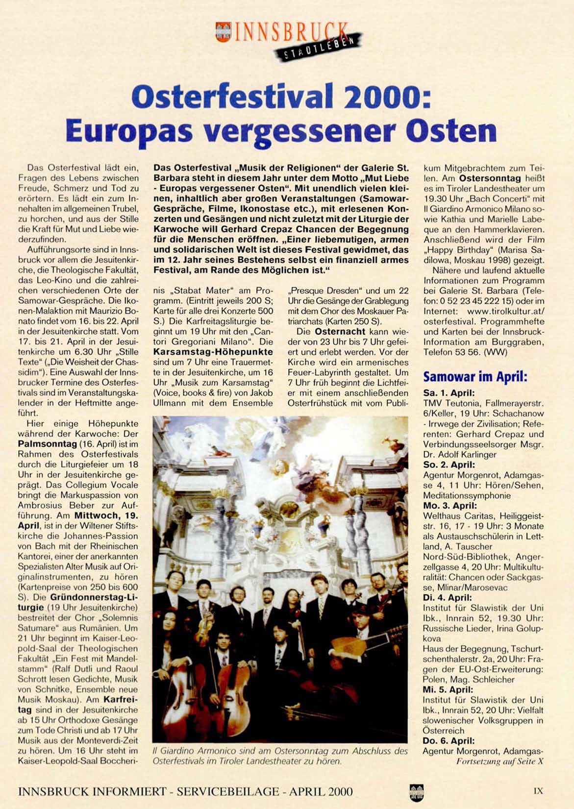 Texte" („Die Weisheit der Chassidirn"). Eine Auswahl der Innsbrucker Termine des Osterfestivals sind im Veranstaltungskalender in der Heftmitte angeführt.
