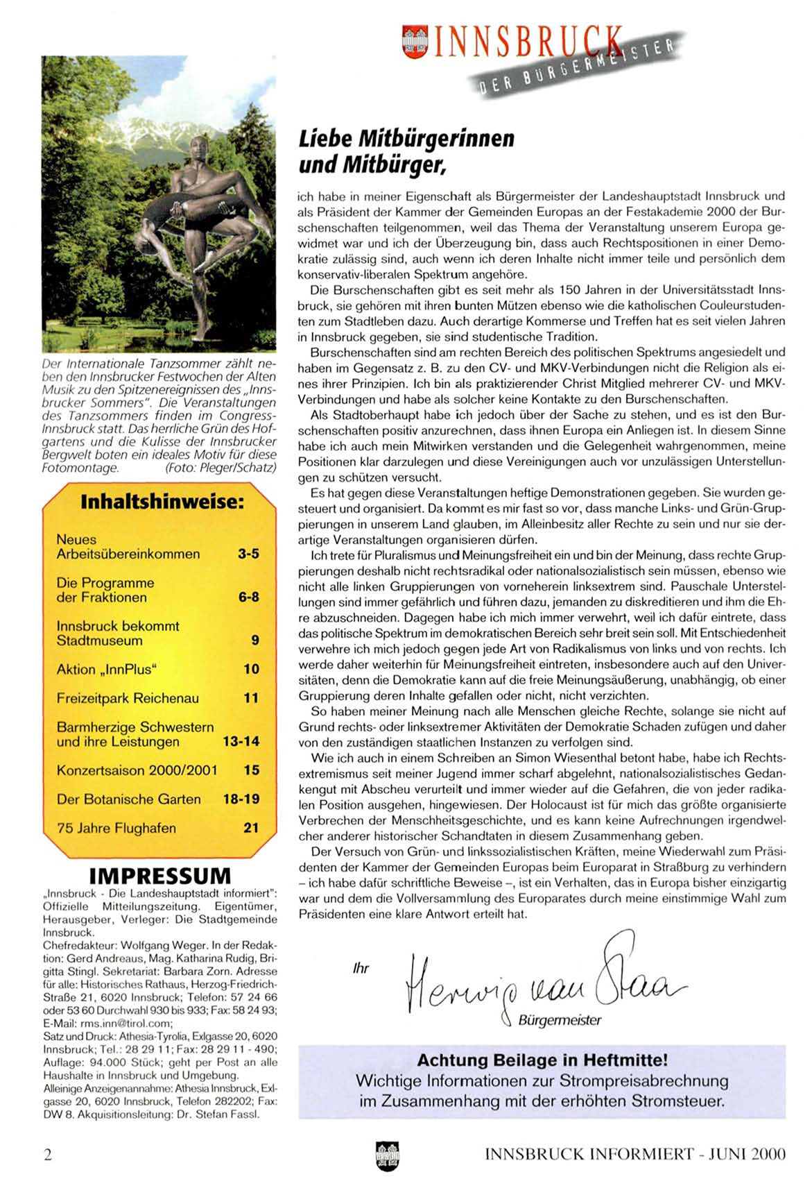 als Präsident der Kammer der Gemeinden Europas an der Festakademie 2000 der Burschenschaften teilgenommen, weil das Thema der Veranstaltung unserem Europa gewidmet war und ich der Überzeugung bin, dass auch Rechtspositionen in einer Demokratie zulässig sind, auch wenn ich deren Inhalte nicht immer teile und persönlich dem