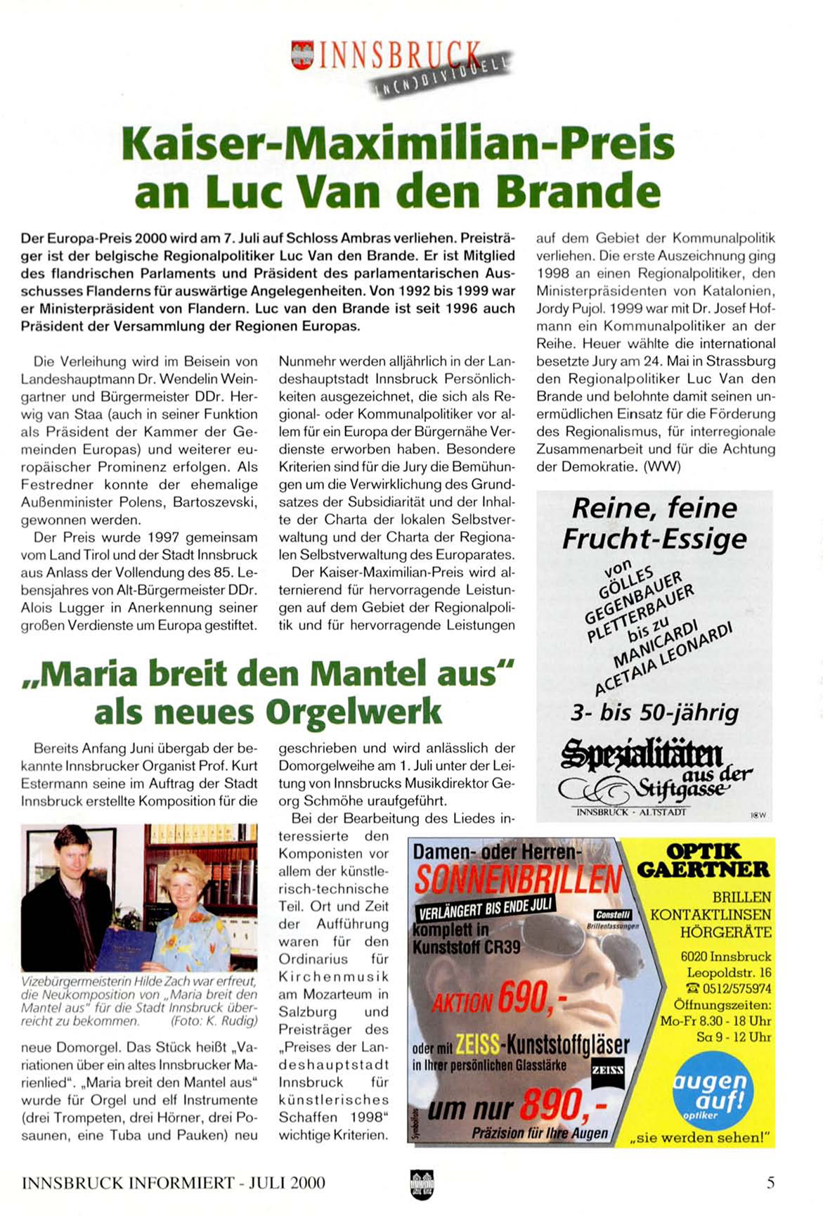 Der E u r o p a - P r e i s 2 0 0 0 w i r d a m 7. Juli auf S c h l o s s A m b r a s v e r l i e h e n . Preisträger ist der b e l g i s c h e R e g i o n a l p o l i t i k e r Luc Van d e n B r a n d e . Er ist M i t g l i e d