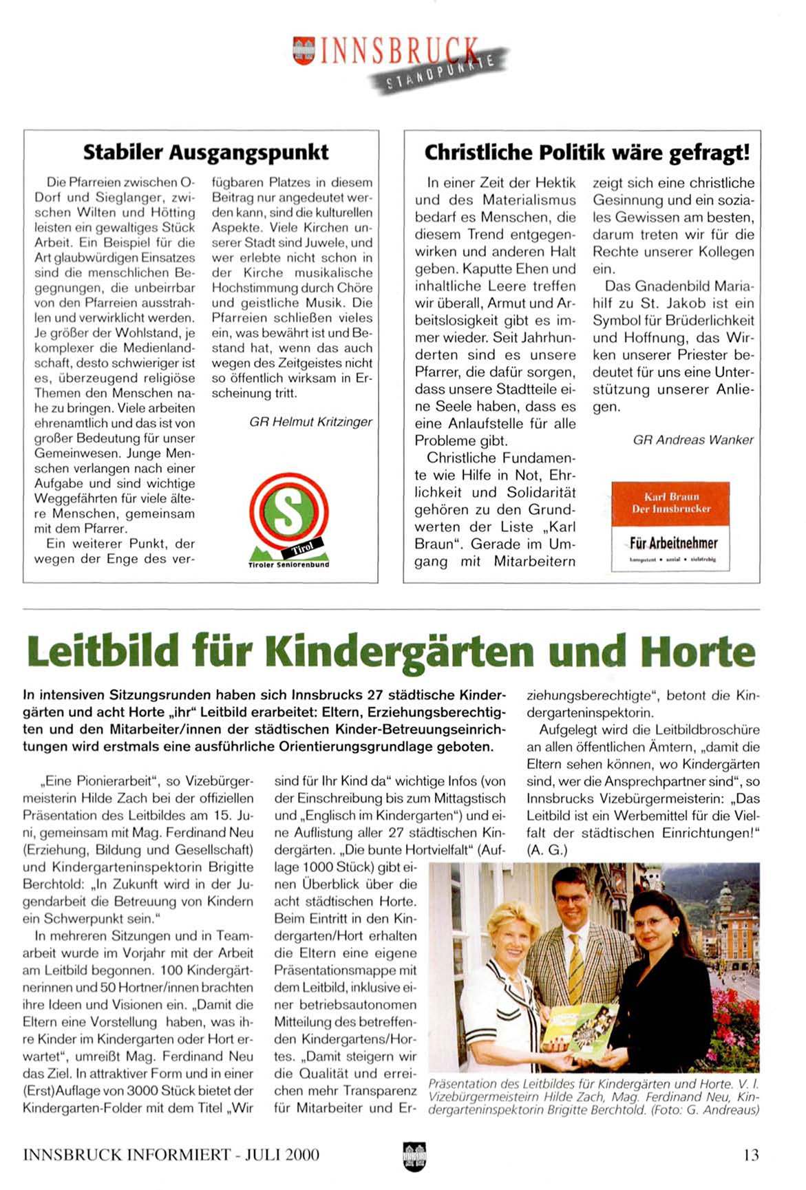 In i n t e n s i v e n S i t z u n g s r u n d e n h a b e n s i c h I n n s b r u c k s 2 7 s t ä d t i s c h e K i n d e r gärten und acht Horte „ihr" Leitbild erarbeitet: Eltern, Erziehungsberechtigten und den Mitarbeiter/innen der städtischen Kinder-Betreuungseinrichtungen wird erstmals eine ausführliche Orientierungsgrundlage geboten.