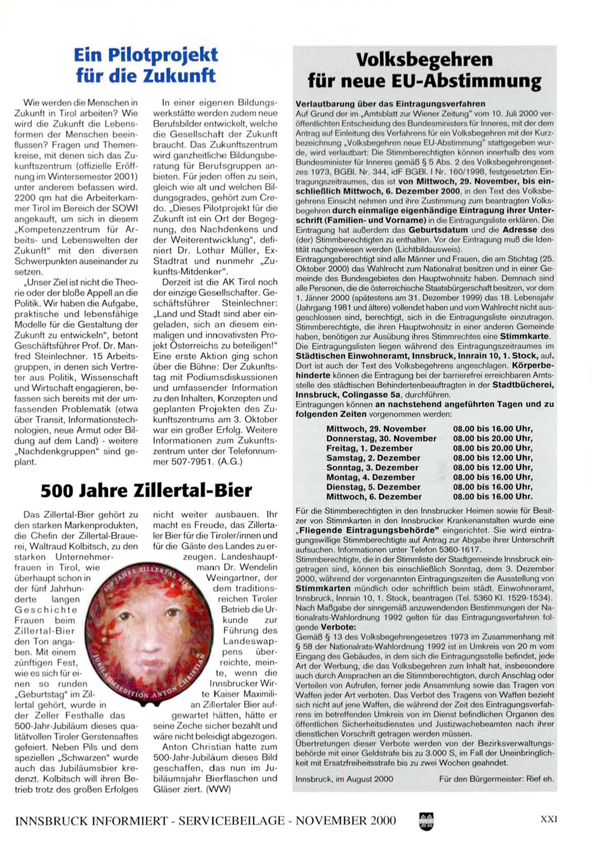 zes 1973, BGBl. Nr. 344, idF BGBl. I Nr. 160/1998, festgesetzten Eintragungszeitiaumes. das ist v o n M i t t w o c h , 29. N o v e m b e r , b i s e i n s c h l i e ß l i c h M i t t w o c h , 6. D e z e m b e r 2000, in den lex! des Volksbegehrens, hinsieht nehmen und ihre Zustimmung zum beantragten Volksbegehren d u r c h e i n m a l i g e e i g e n h ä n d i g e E i n t r a g u n g ihrer Unters c h r i f t ( F a m i l i e n - u n d V o r n a m e ) in die Eintragungsliste erklären. Die