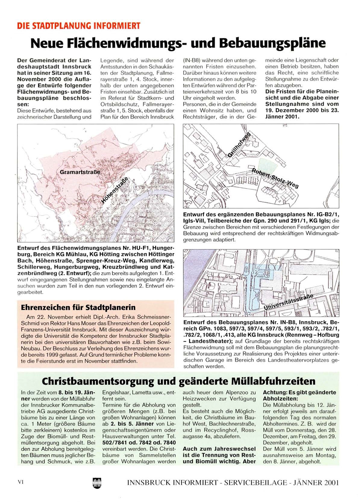 Am 22. November erhielt Dipl.-Arch. Erika SchmeissnerSchmid von Rektor Hans Moser das Ehrenzeichen der LeopoldFranzens-Universität Innsbruck. Mit dieser Auszeichnung würdigte die Universität die Kompetenz der Innsbrucker Stadtplanerin bei den universitären Bauvorhaben wie z.B. beim SowiNeubau. Der Beschluss zur Verleihung des Ehrenzeichens wurde bereits 1999 gefasst. Auf Grund terminlicher Probleme konnte die Feierstunde erst im November stattfinden.