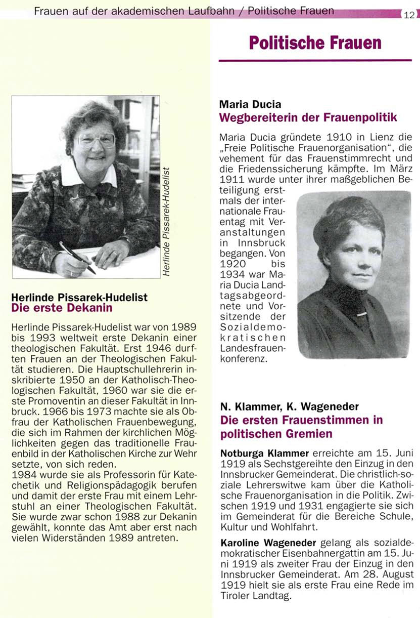 theologischen Fakultät. Erst 1946 durften Frauen an der Theologischen Fakultät studieren. Die Hauptschullehrerin inskribierte 1950 an der Katholisch-Theologischen Fakultät, 1960 war sie die erste Promoventin an dieser Fakultät in Innbruck. 1966 bis 1973 machte sie als Obtrau der Katholischen Frauenbewegung,