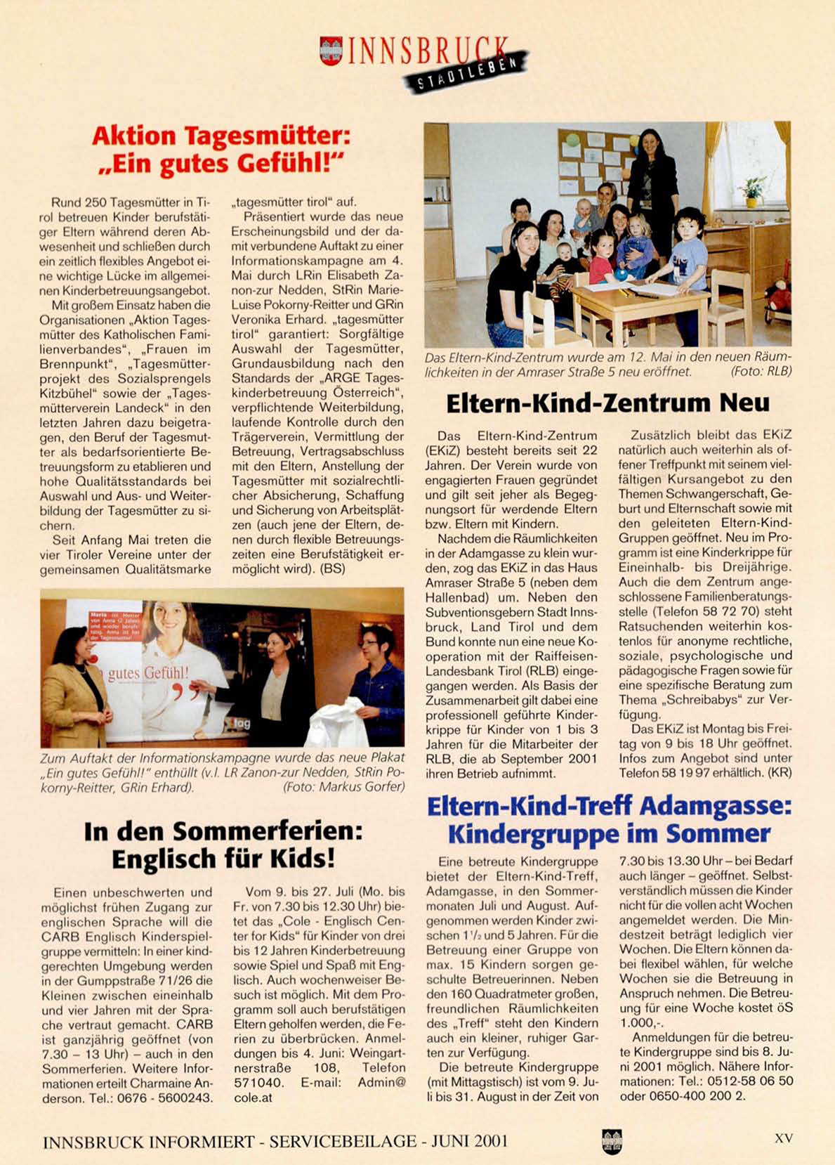 Anmeldungen für die betreute Kindergruppe sind bis 8. Juni 2001 möglich. Nähere Informationen: Tel.: 0512-58 06 50