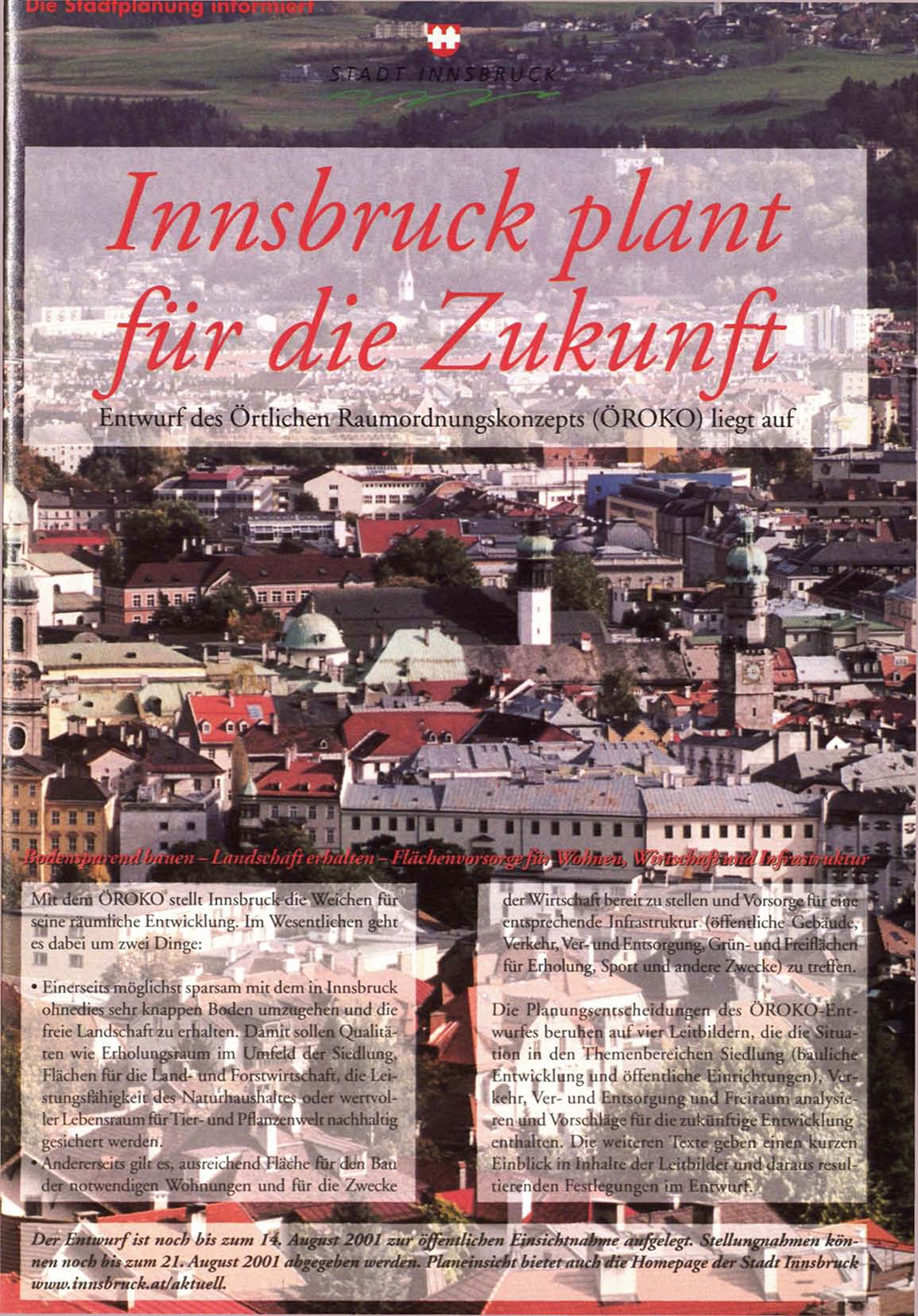 Der Entwurf ist noch bis zum 14. August 2001 zur öffentlichen Einsichtnahme aufgelegt. Stellungnahmen können noch ins zum 21. August 2001 abgegeben werden. Planeinsieht bietet auch die Homepage der Stadt Innsbruck