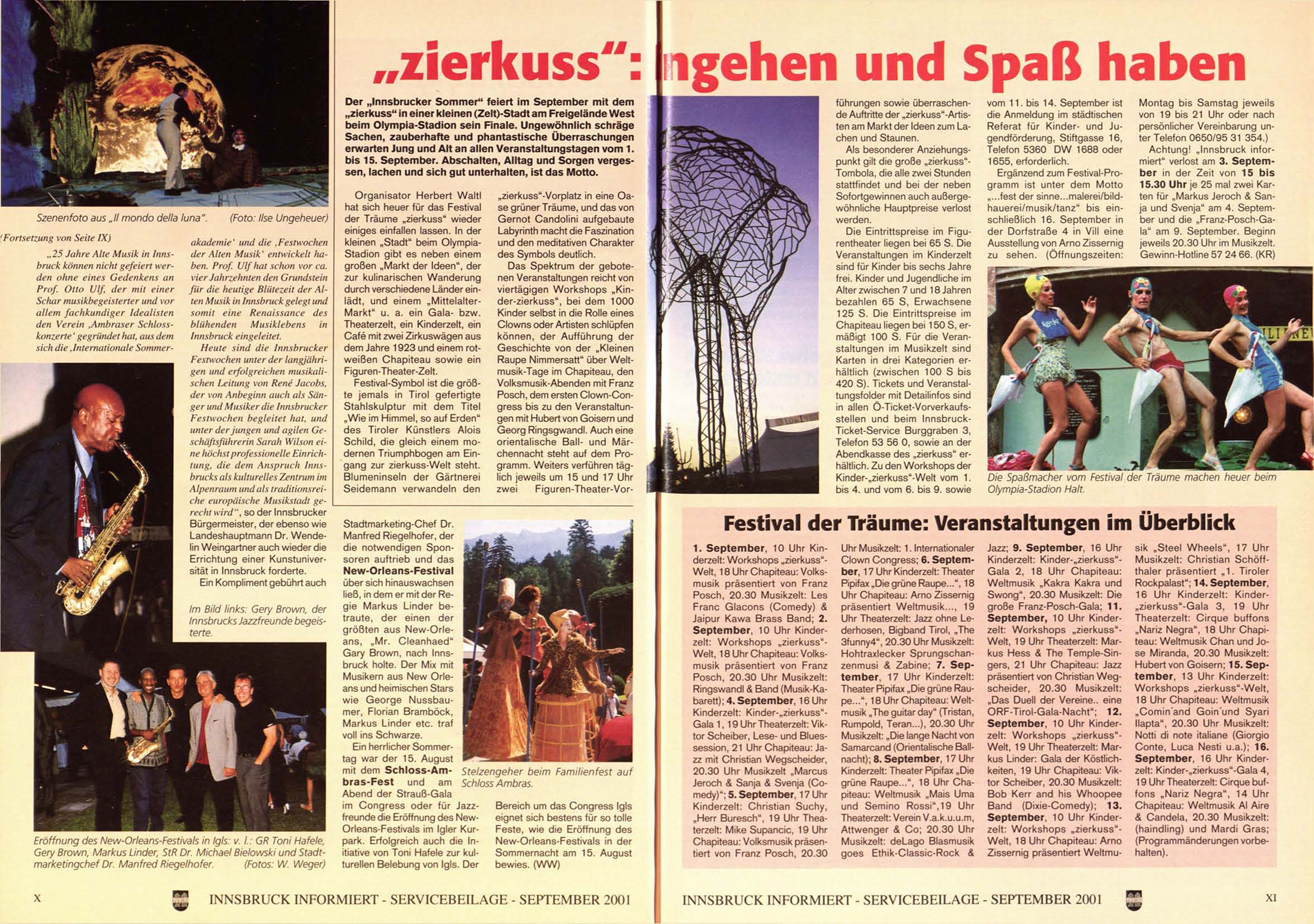 1. S e p t e m b e r , 1 0 U h r K i n derzelt: W o r k s h o p s „zierkuss"W e l t , 18 U h r C h a p i t e a u : V o l k s musik präsentiert von Franz
