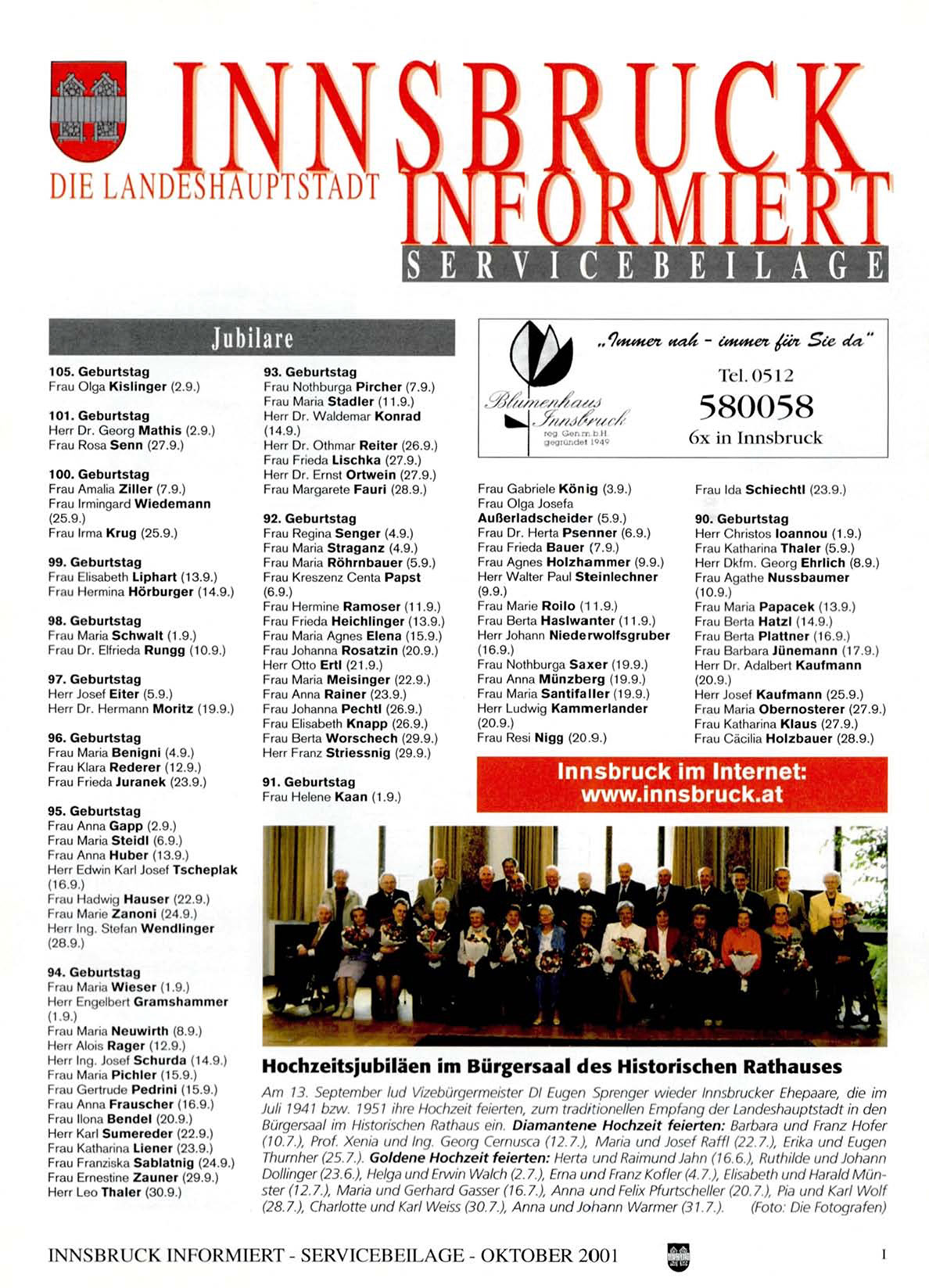 Am 13. September lud Vizebürgermeister DI Eugen Sprenger wieder Innsbrucker Ehepaare, die im
