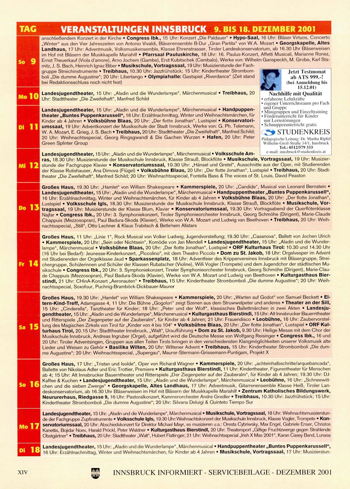 mit Studierenden der Orgelklasse Jaud • S p a r k a s s e n p l a t z , 18 Uhr: Adventfeier des Krippenvereines Innsbruck mit Bläsergruppe, Streichergruppe, Schülerinnen und Schüler der Klassen Rubatscher (Violine), Willi Vogler (Trompete) und dem Jugendchor der städtischen Musikschule « C o n g r e s s Ibk., 20 Uhr: 3. Symphoniekonzert, Tiroler Symphonieorchester Innsbruck, Georg Schmöhe (Dirigent), Marie-Claude Chappuis (Mezzosopran), Paul Badura-Skoda (Klavier), Werke von W.A. Mozart und Ludwig van Beethoven • K u l t u r g a s t h a u s Biers t i n d l , 21 Uhr: CHinA-Konzert „Aeronauten" • T r e i b h a u s , 15 Uhr: Kindertheater Strombomboli „Die dumme Augustine"; 20 Uhr: Weihnachtsspecial, Soxofour, Puchnig-Bramböck-Dickbauer-Maurer