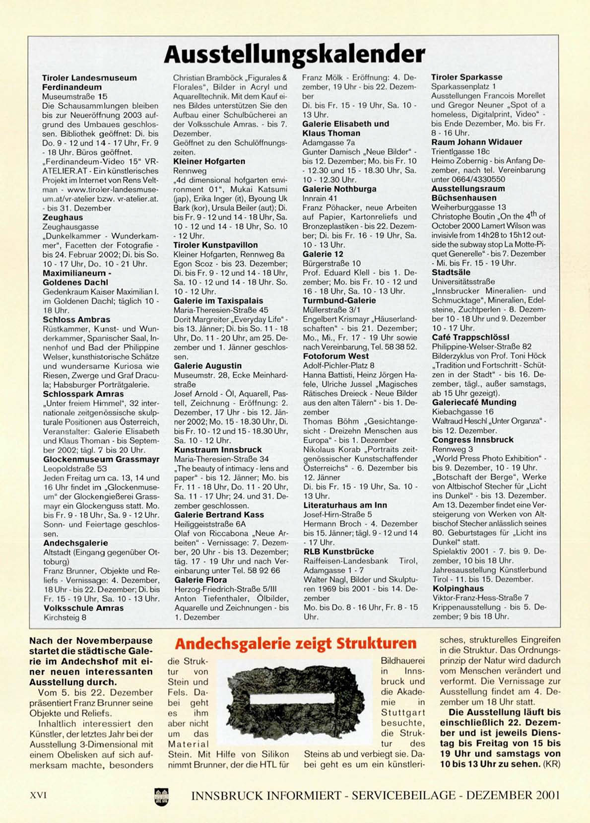 Dezember, 17 Uhr - bis 12. Jänner 2002; Mo. 1 5 - 1 8 . 3 0 Uhr, Di.