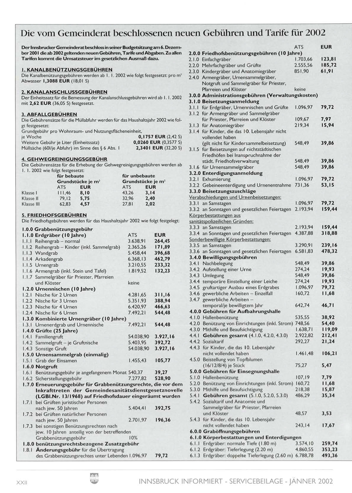 Der Innsbrucks" GiMiicinclor.it beschloss in seiner Budgetsitzung am 6. Dezeniber 200 I die ab 2002 geltenden neuen Gebühren, Tarife und Abgaben. Zu allen