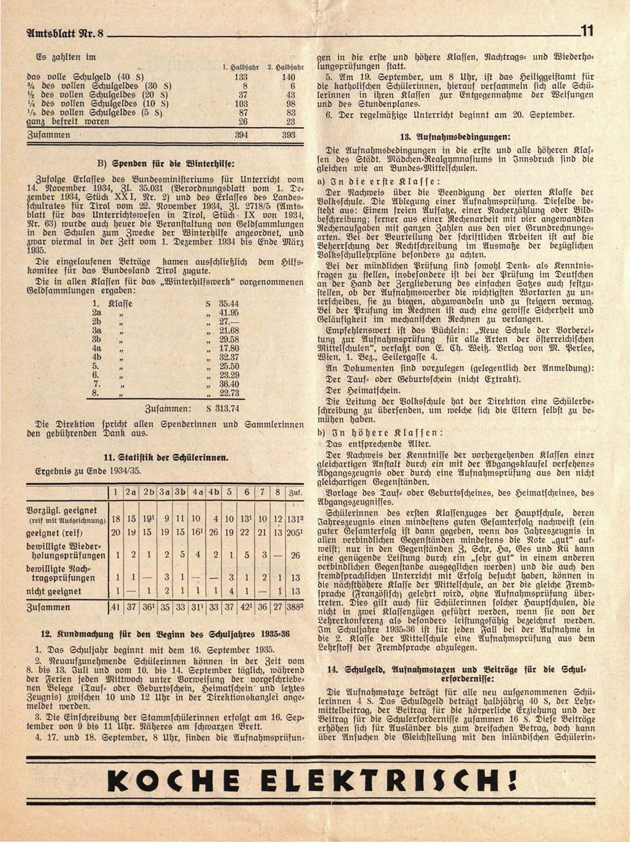 Die Ablegung einer Aufnahmsprüfung. Dieselbe beschulrates für Tirol vom 22. November 1934, Zl. 2718/5 (Amtsblatt für das Unterrichtswefen in Tirol, Stück I X von 193^, steht aus: Einem freien Aufsatze, einer Nacherzählung oder BildNr. 63) wurde auch Heuer die Veranstaltung von Geldsammlungen beschreibung: ferner aus einer Rechenarbeit mit vier angewandten
