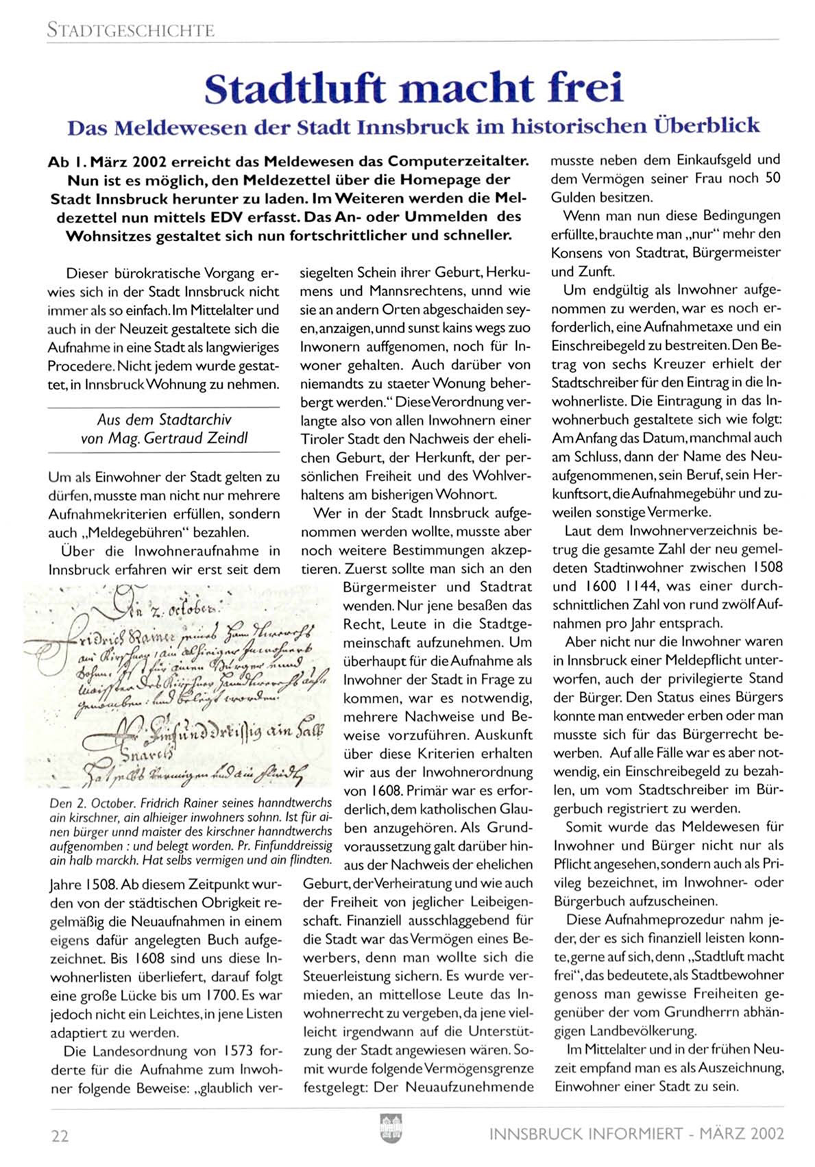 Das Meldewesen d e r Stadt Innsbruck im historischen Überblick