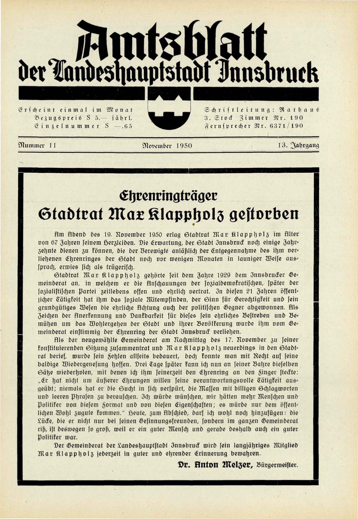 Stadtrat Tllar k l a p p h o l z gehörte seit dem Jahre 1939 dem Znnsbrucker <3emeinoerat an, in welchem er die Anschauungen der sozialdemokratischen, später der