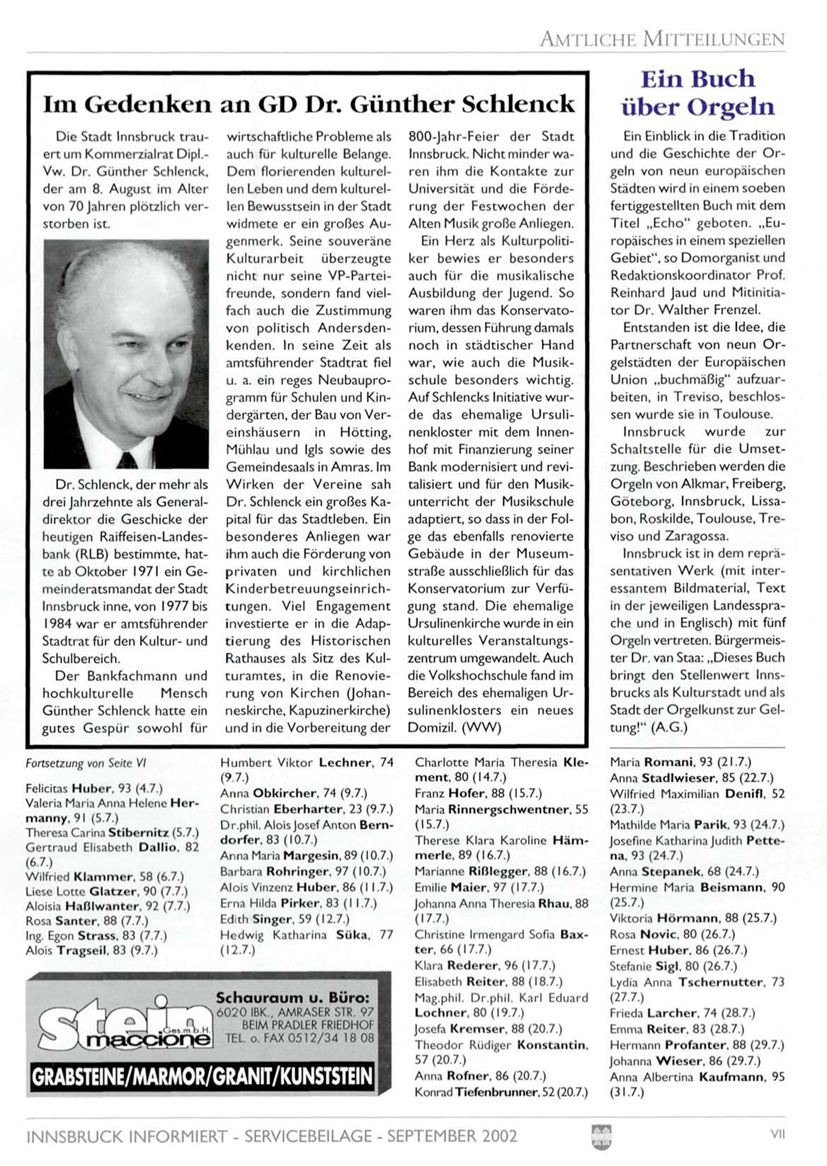 Die Stndt Innsbruck trauert um Kommerzialrnt Dipl.Vw. Dr. Günther Schlenck,