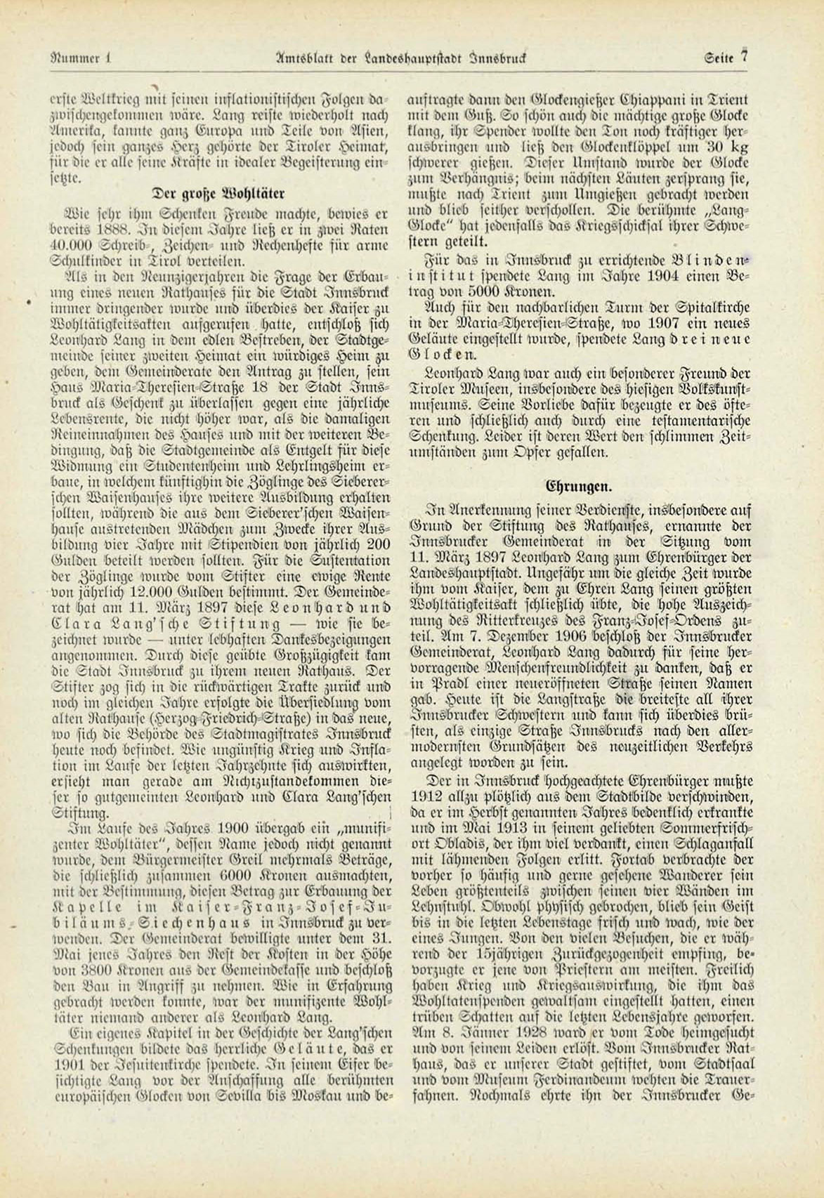 Für das in Iuusbruck ;u errichtende B l i n d e n i n s t i t n t spendete Lang im Jahre 1904 einen Betrag vou 5000 Kronen.